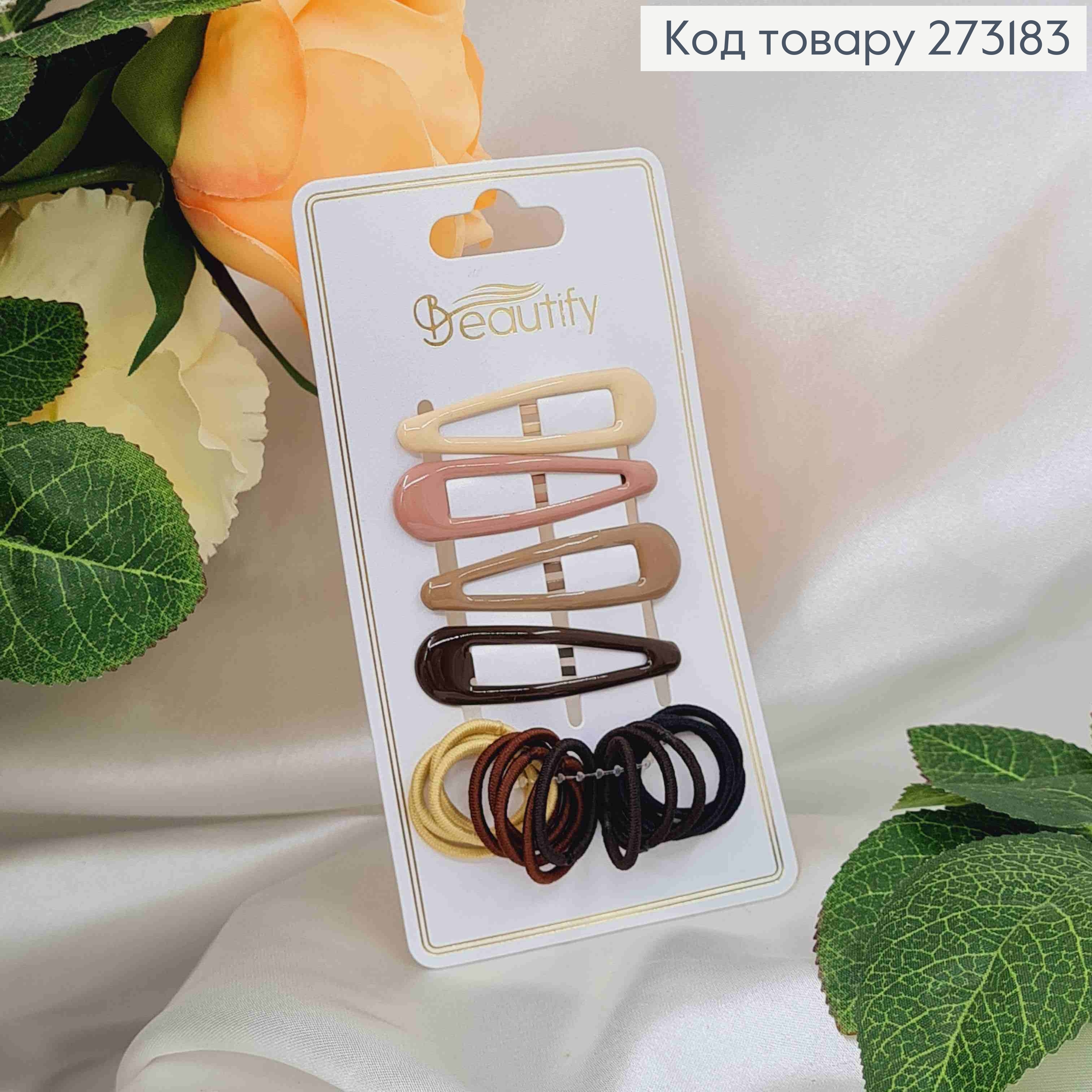 Заколки Тік-Так (4шт) 5см + резинки (16шт)3см, коричневих відтінків, Beautify.