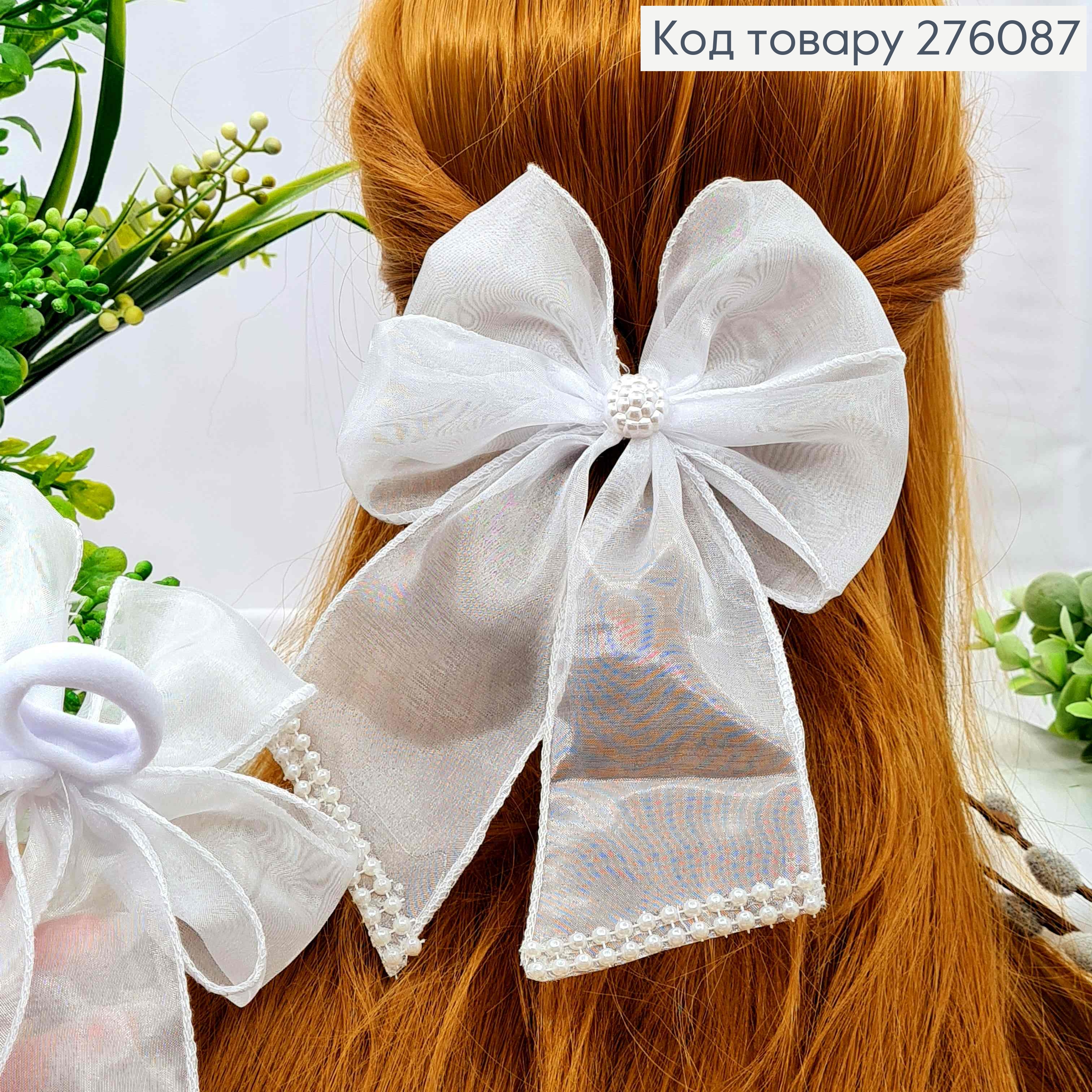 Бант атласный с бусинками, БЕЛЫЙ на резинке, размер 12*20см, ручная работа, Украина. 276166 фото