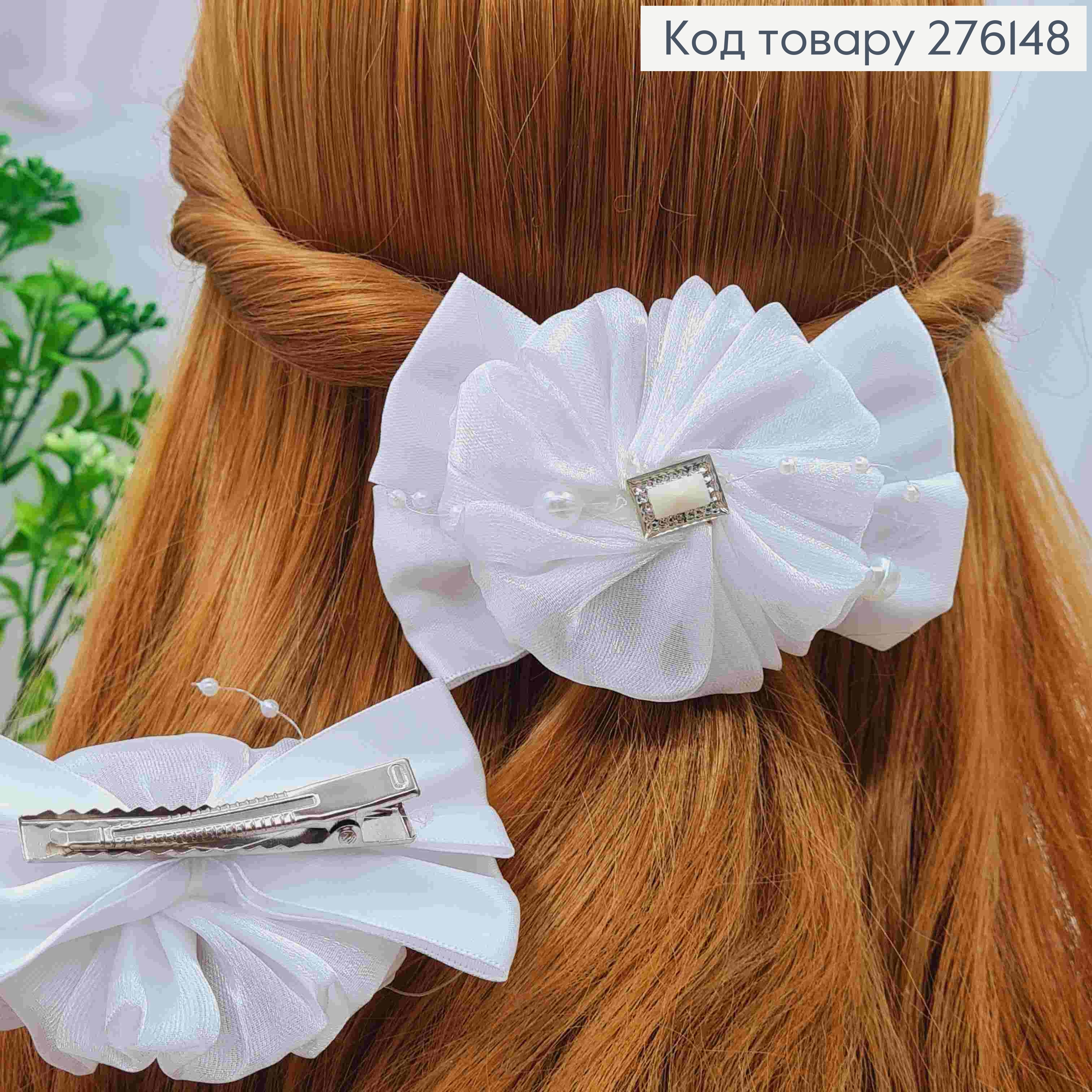 Бант БЕЛЫЙ с Бусинками, на заколке 5,5см, ткань атлас+органза, размер 10*6,5см, ручная работа