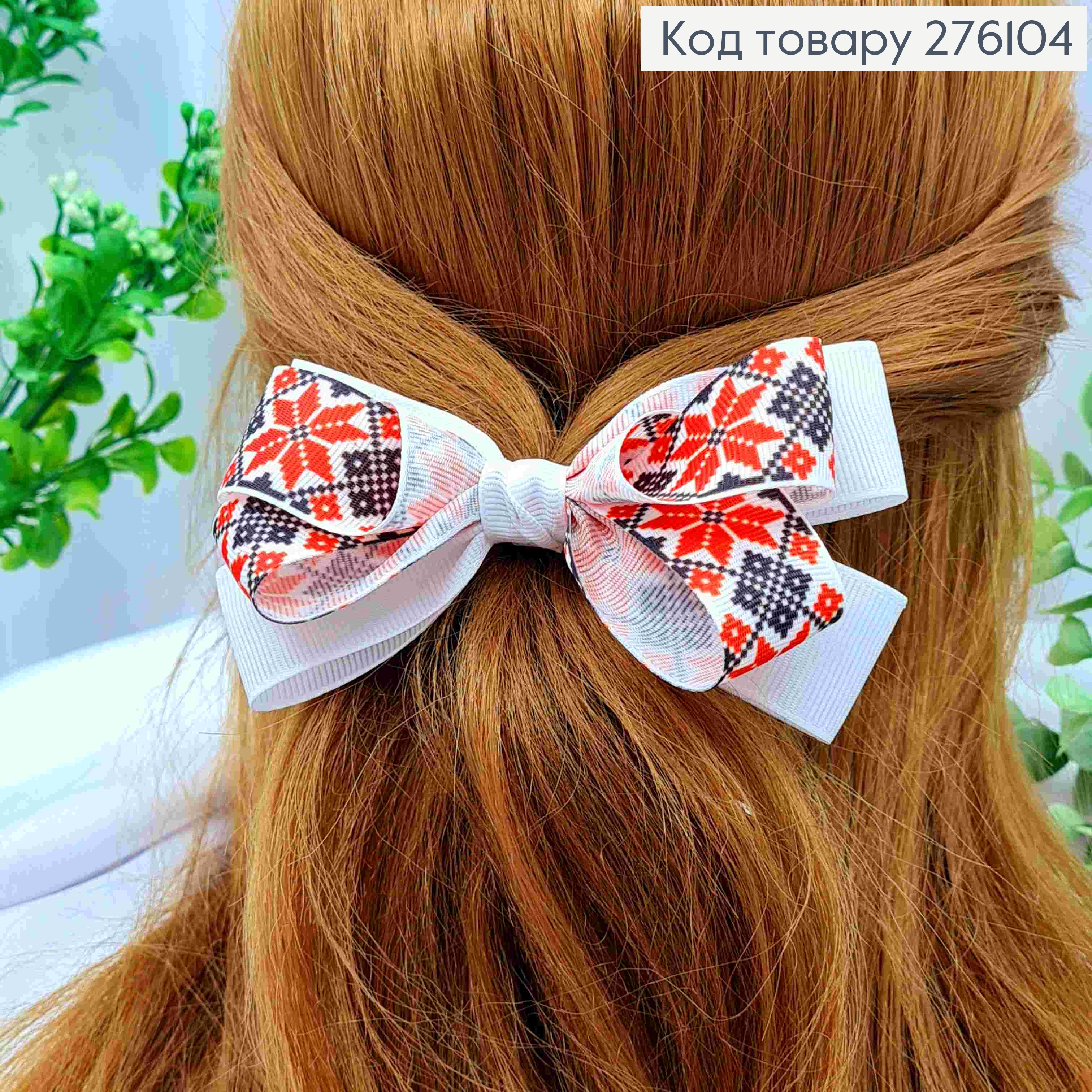 Бант БЕЛЫЙ с Красно-Черным орнаментом, на резинке, ткань репс, размер 10*6см, ручная работа