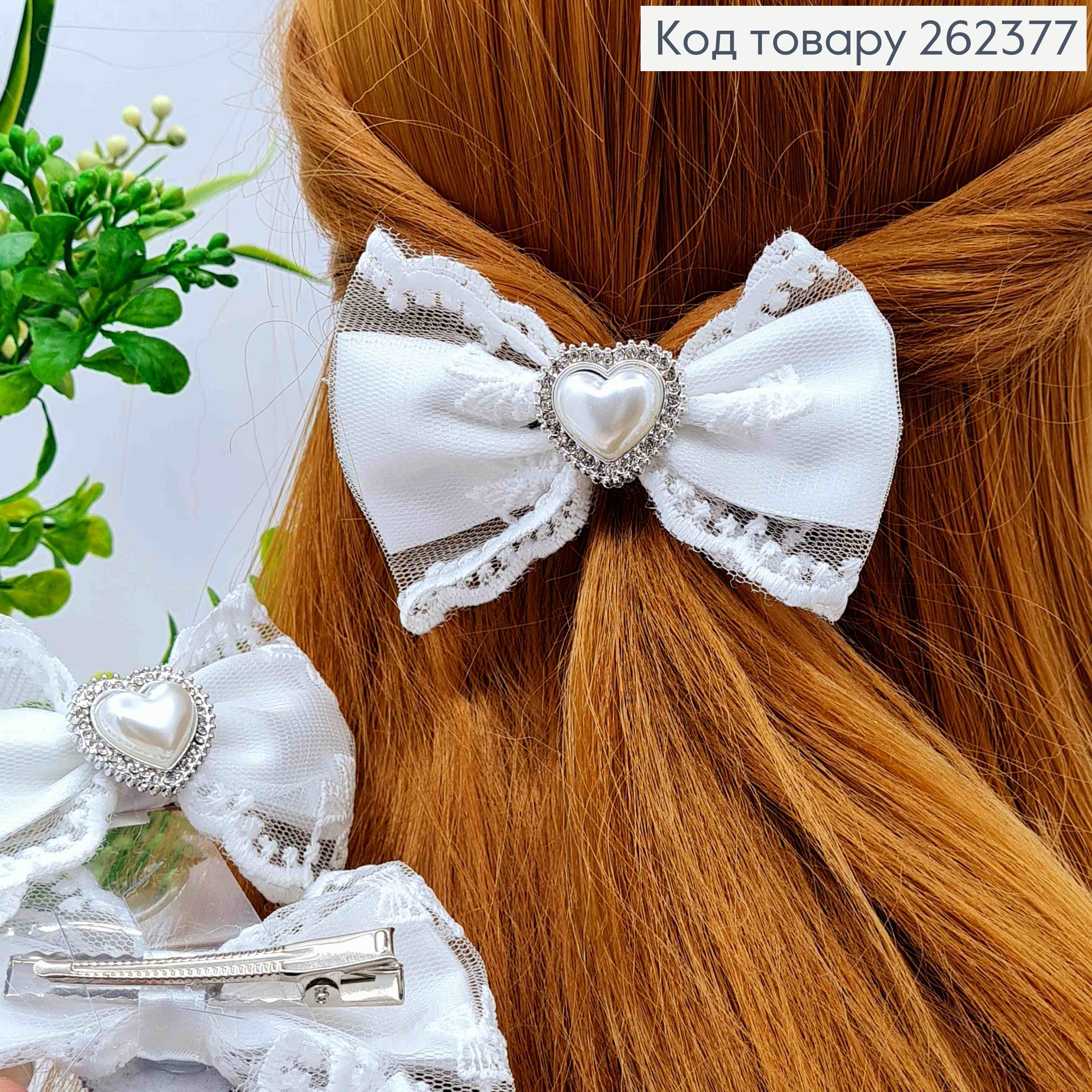 Бант БЕЛЫЙ с Сердцем в камешках, на заколке 6см, ткань кружево, размер 9*6см, руч.
