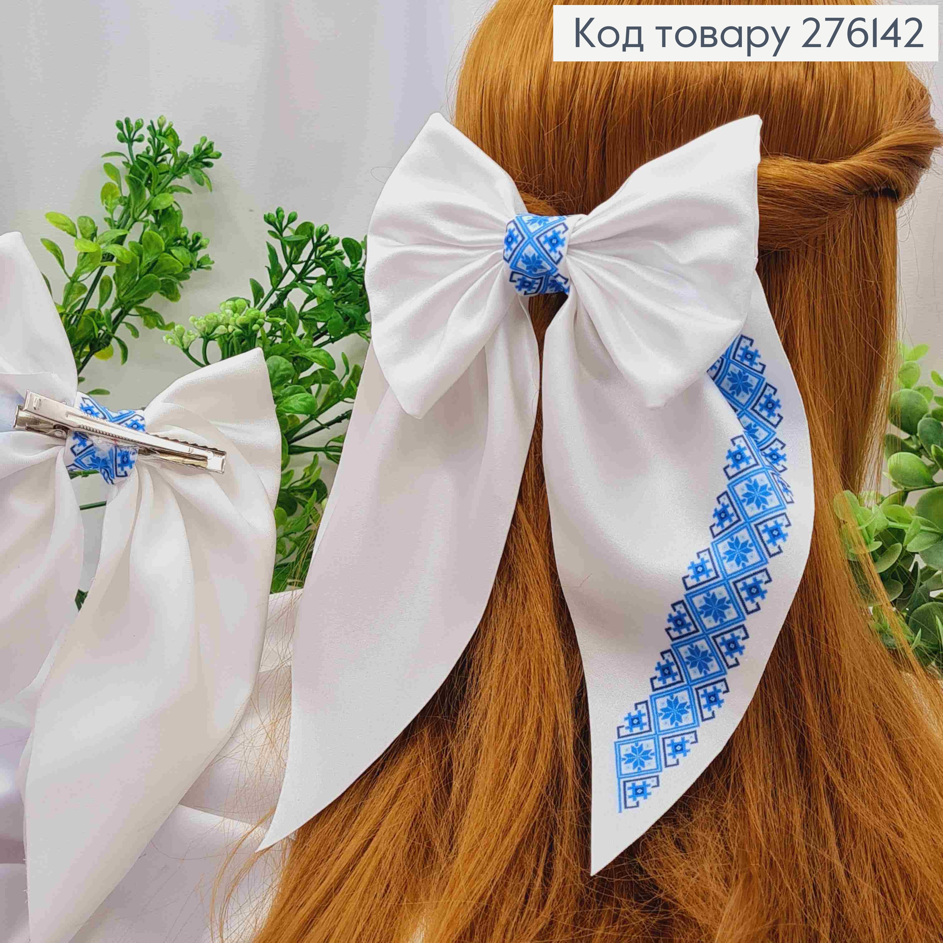 Бант БЕЛЫЙ с Синим орнаментом, на заколке 6,5см, ткань плотный атлас, размером 13*23см, ручная работа