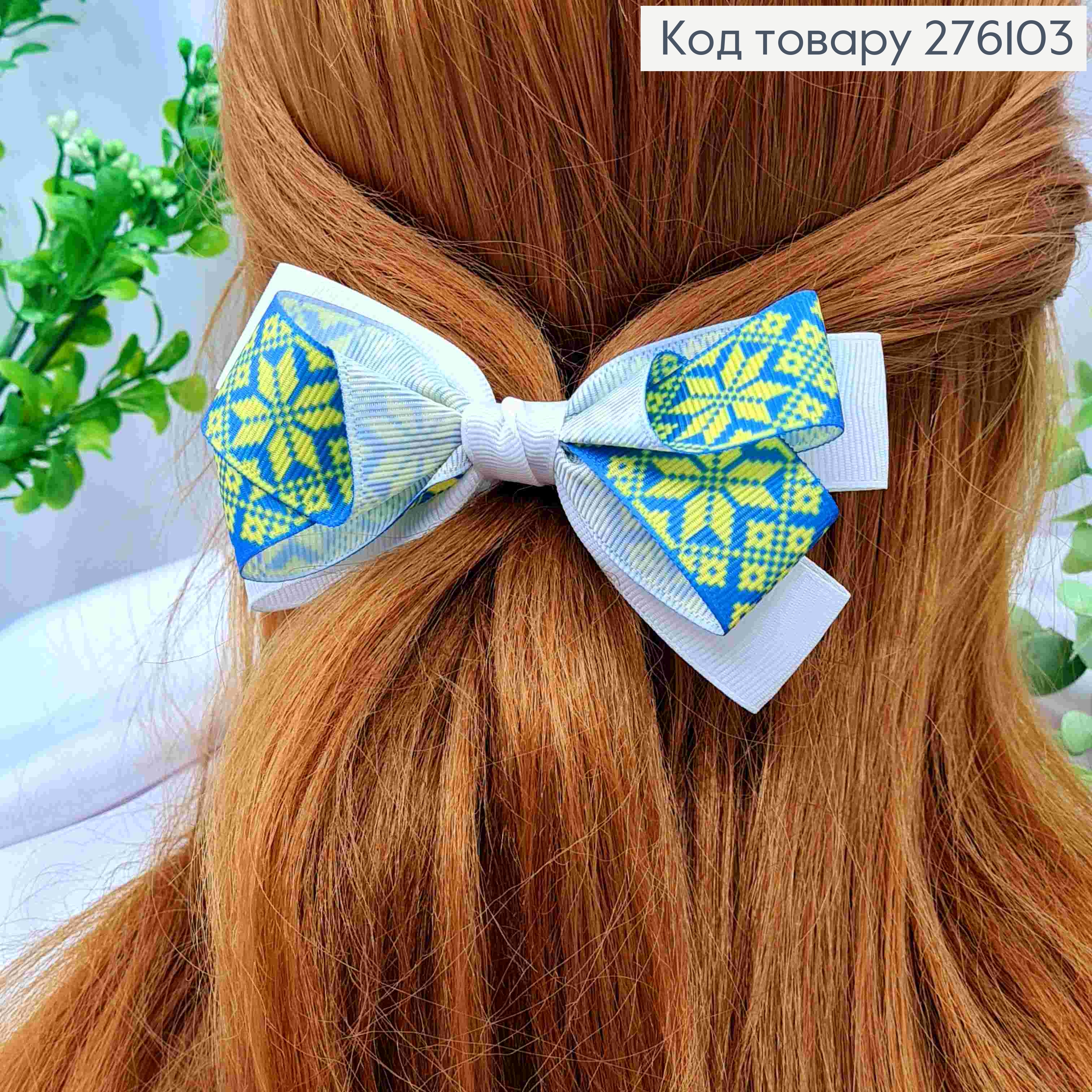 Бант БЕЛЫЙ с Сине-Желтым орнаментом, на резинке, ткань репс, размер 10*6см, ручная работа