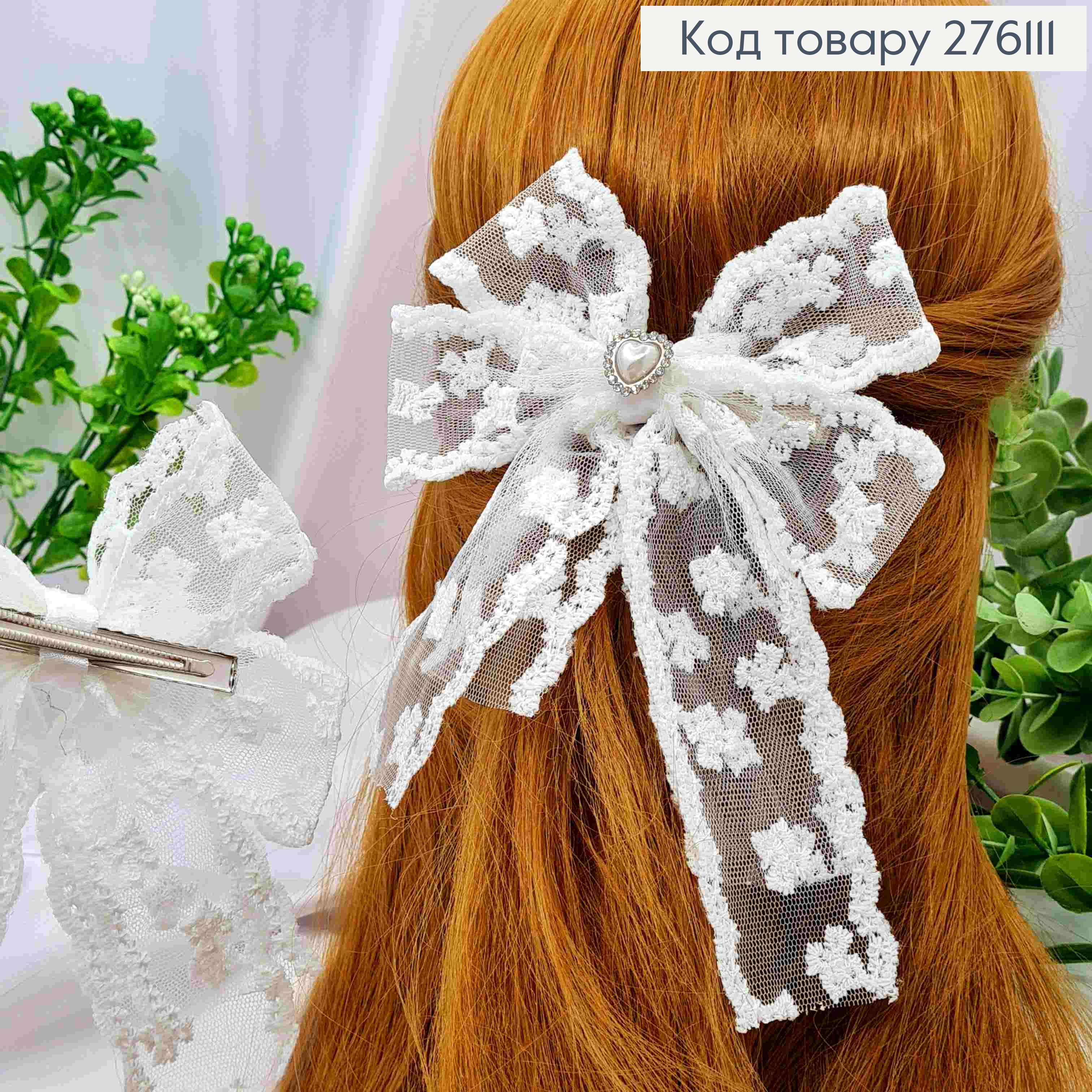 Бант БЕЛОГО цвета с Брошью "СЕРДЦЕ" в камешках, на заколке 7,5см, ткань кружево, размер 13*14см