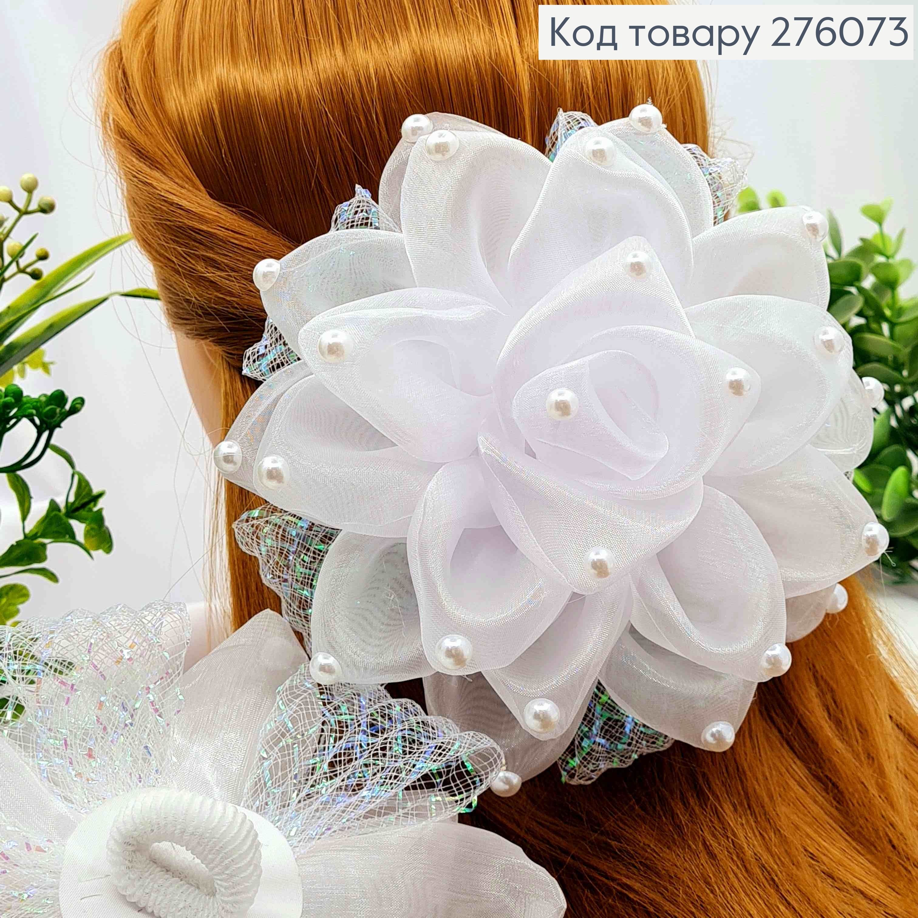 Бант БЕЛОГО цвета с Бусинками и люрексом, на резинке, ткань органза, 15см, ручная работа