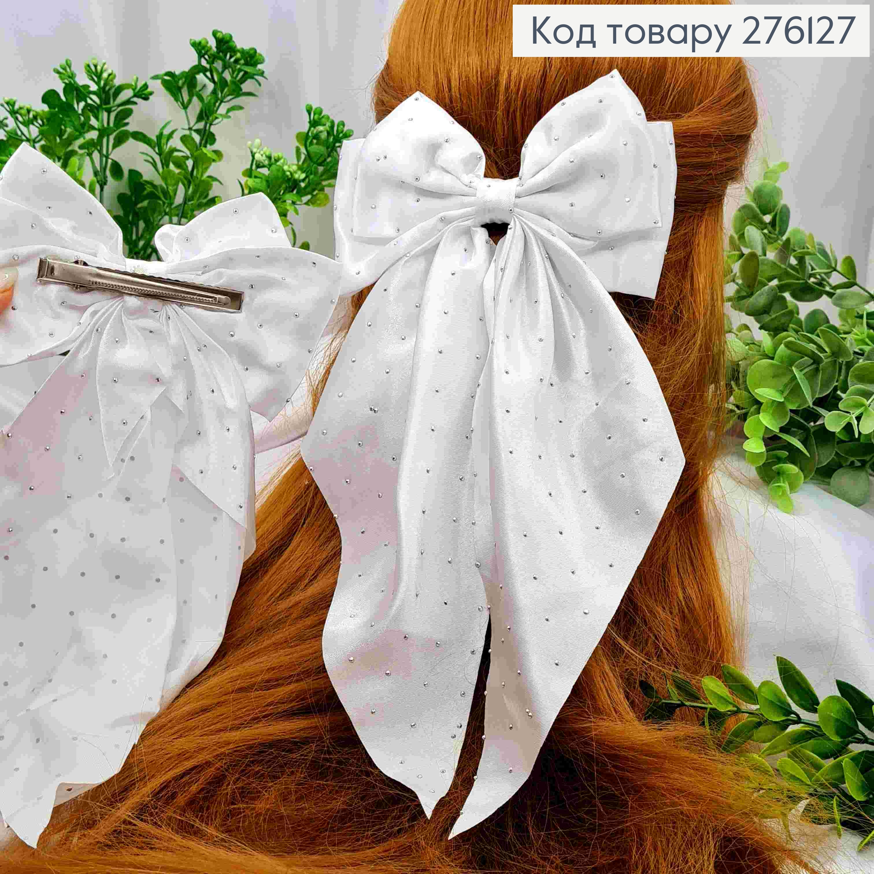 Бант БЕЛОГО цвета со стразами, на заколке 5,5, ткань атлас, размер 10*6,5см, Украина. 276163 фото