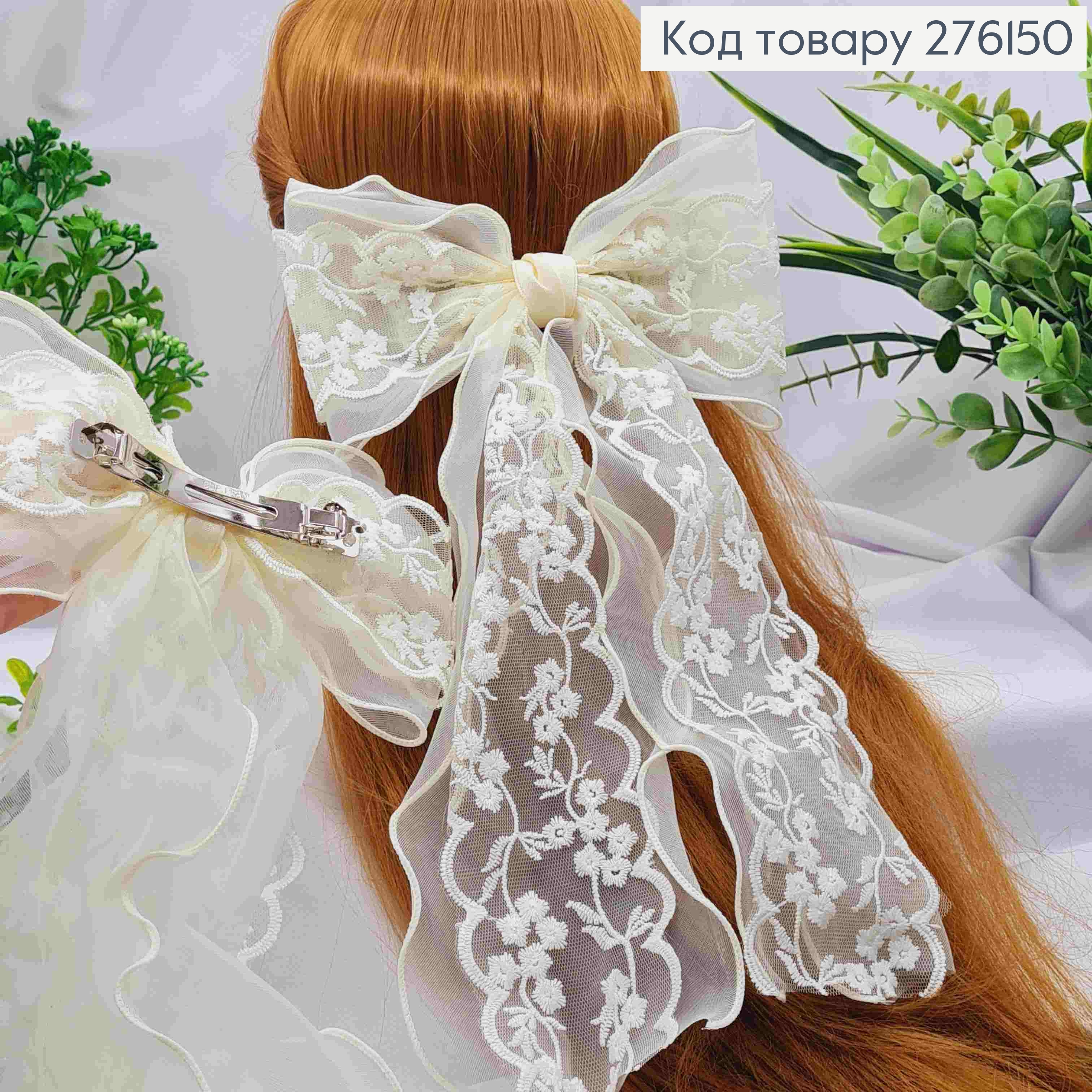 Бант КРЕМОВОЙ, на заколке 10см, ткань органза+кружево, размер 19*35см, ручная работа