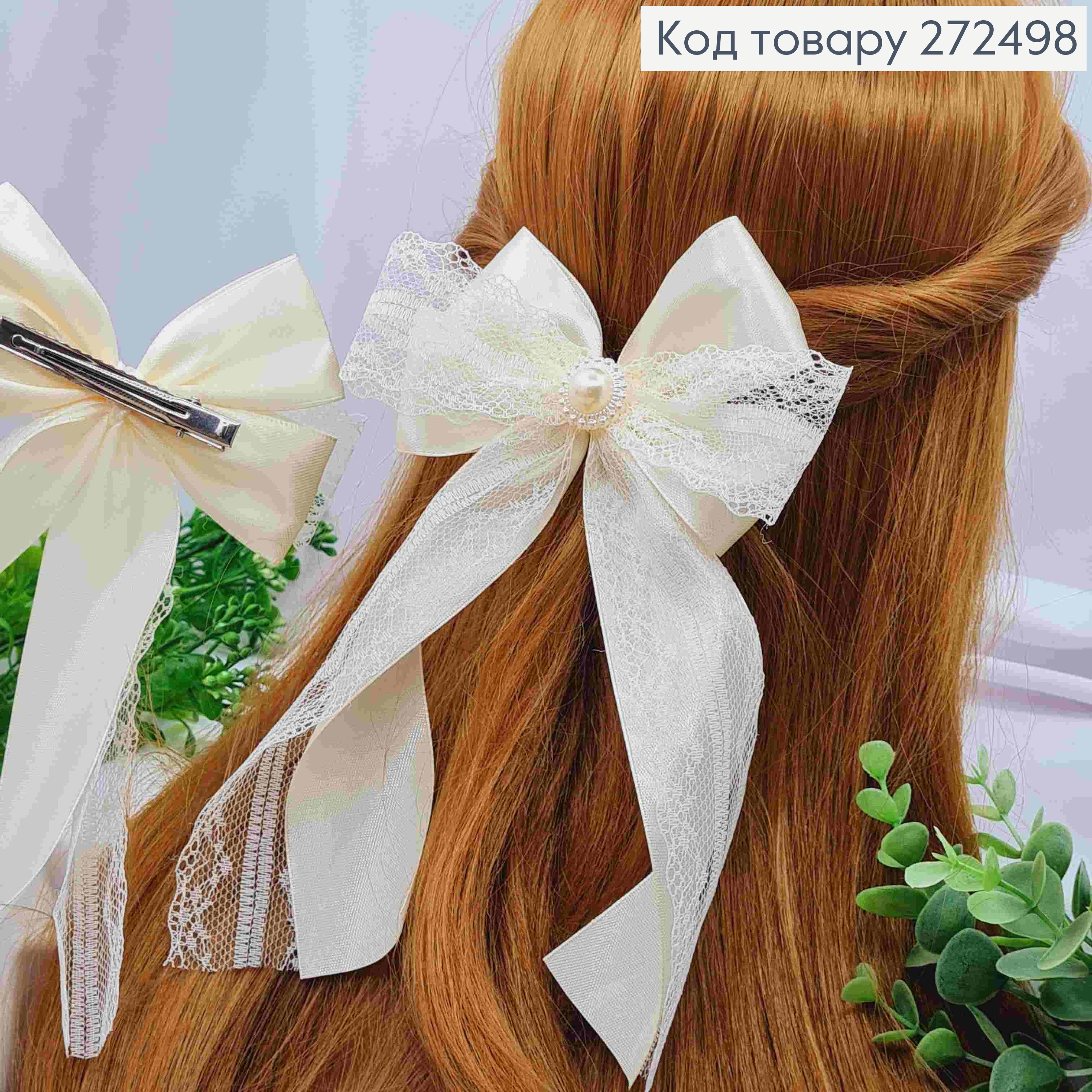 Бант КРЕМОВОГО цвета с Бусинкой, на заколке 6,5см, ткань атлас + кружево, 13*21см, ручная работа