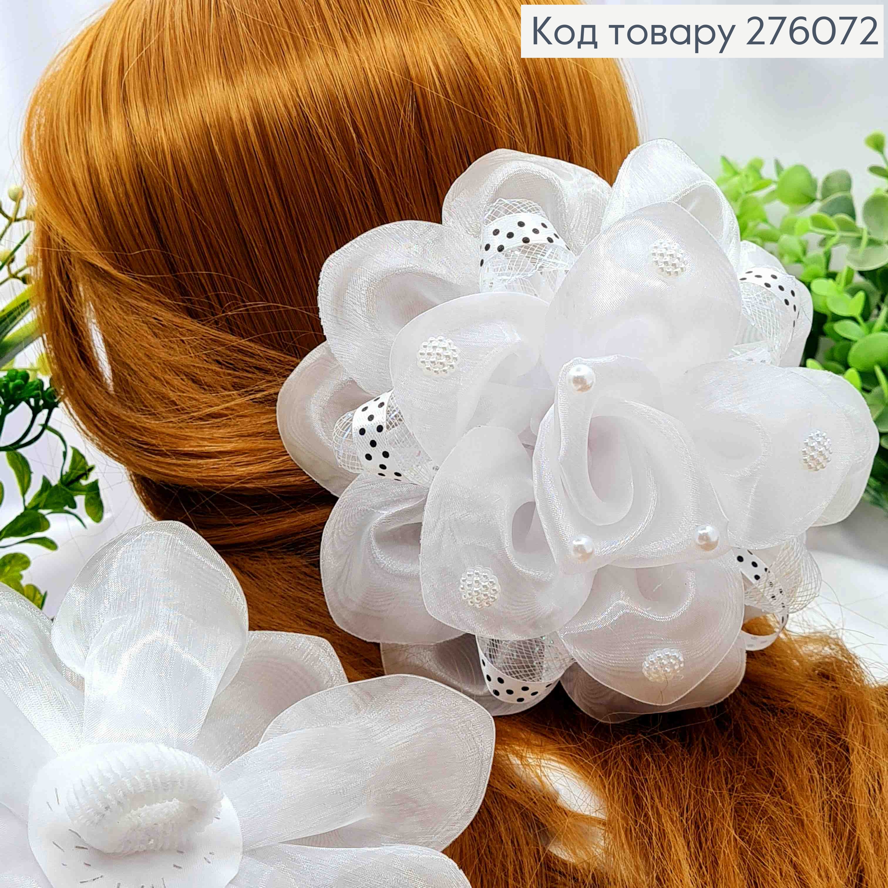 Бант БЕЛОГО цвета с Бусинками в горошек, на резинке, ткань органза + атлас, 16см, ручная работа