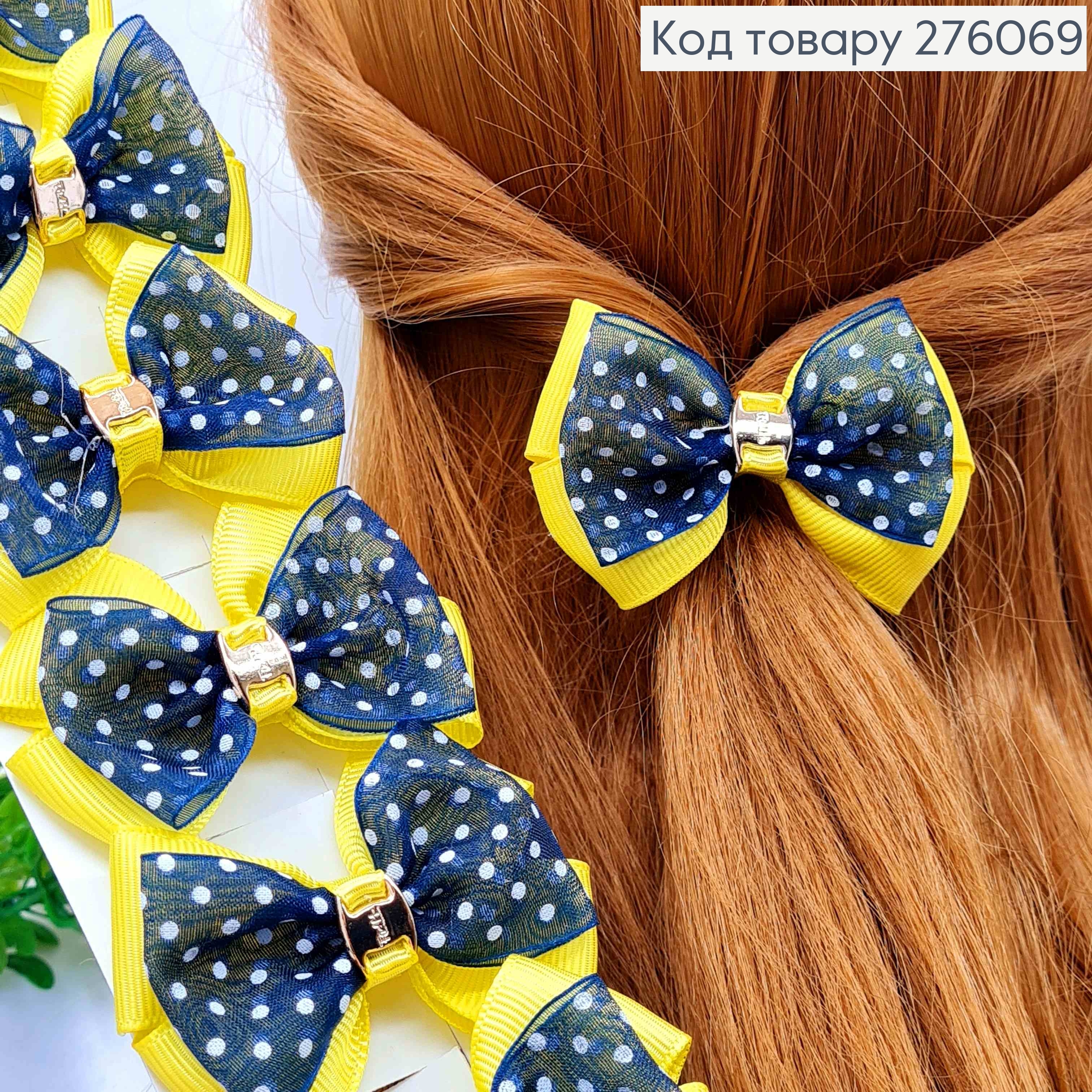 Бант ЖЕЛТО-ЧЕРНЫЙ в горошек, на резинке, ткань репс+органза, размер 6,5*5см, ручная работа