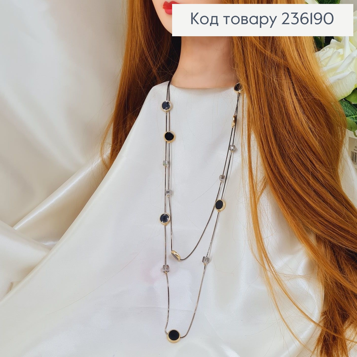 Бижутерия на шею Бусы двойные кружочки с черным камнем 68+4 см