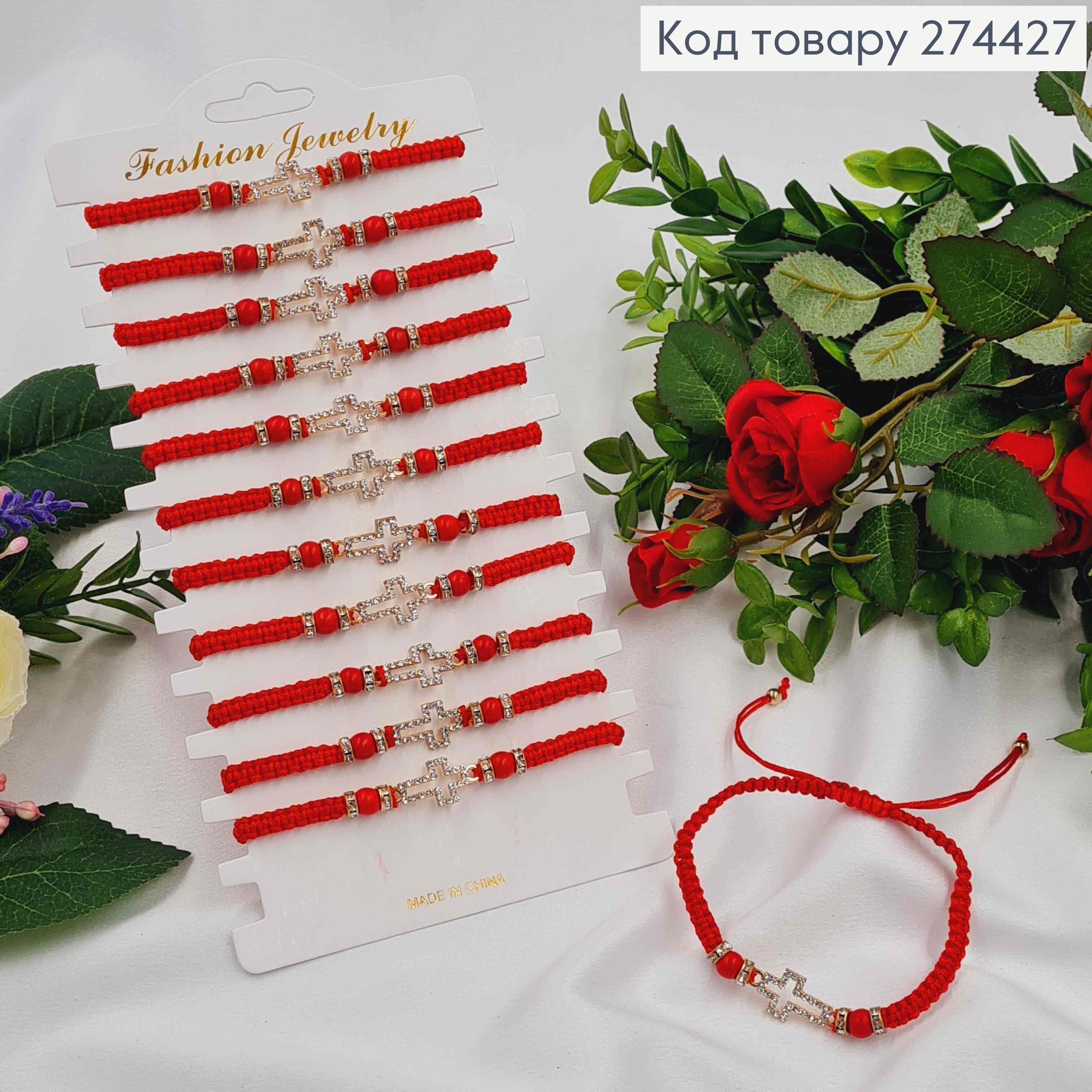 Браслет-оберег красный, плетеный, с Крестиком в камнях, на затяжках
