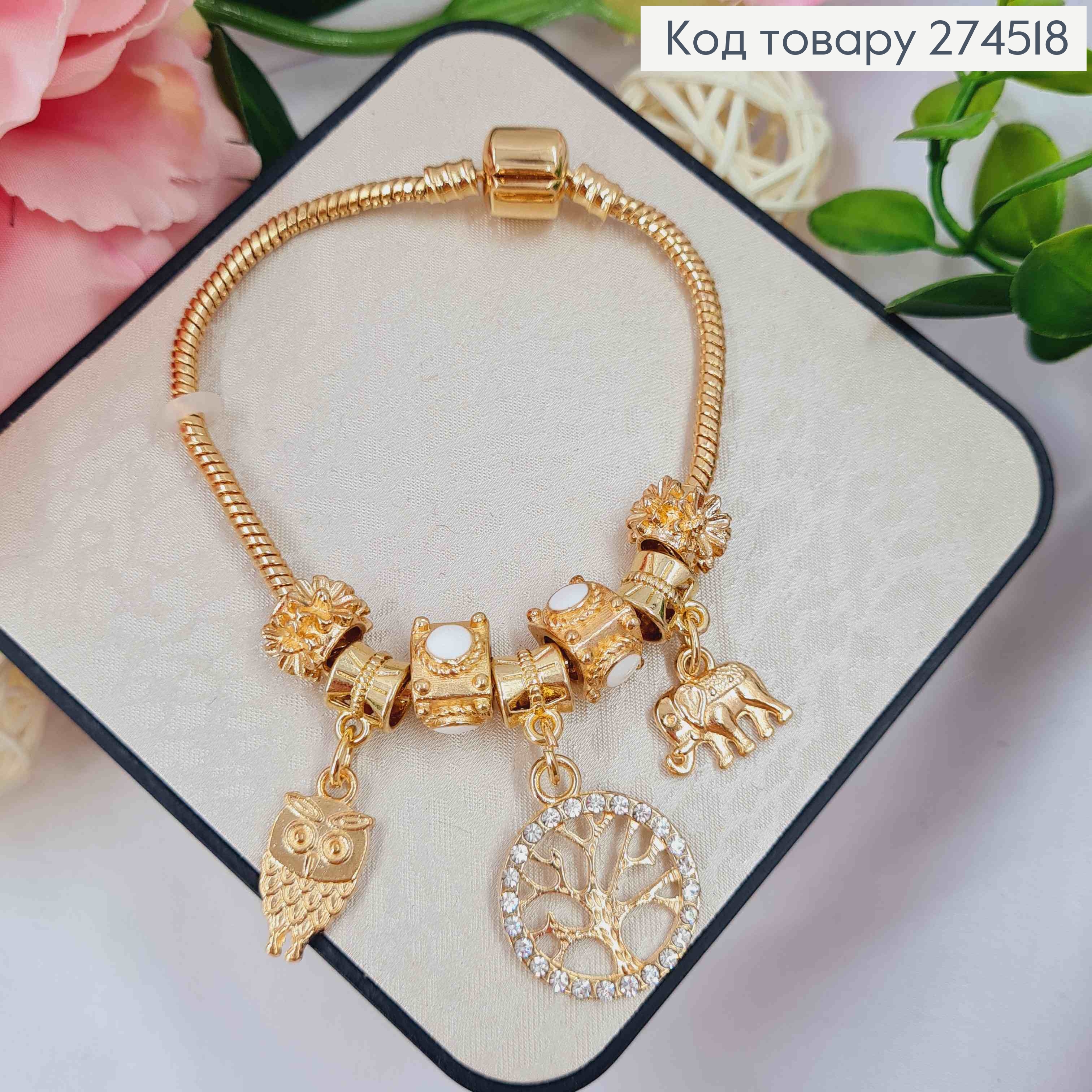 Браслет "ПАНДОРА", шармик с Белым камнем (Дерево/Сова/Слон), золотого цвета, бижутерия.