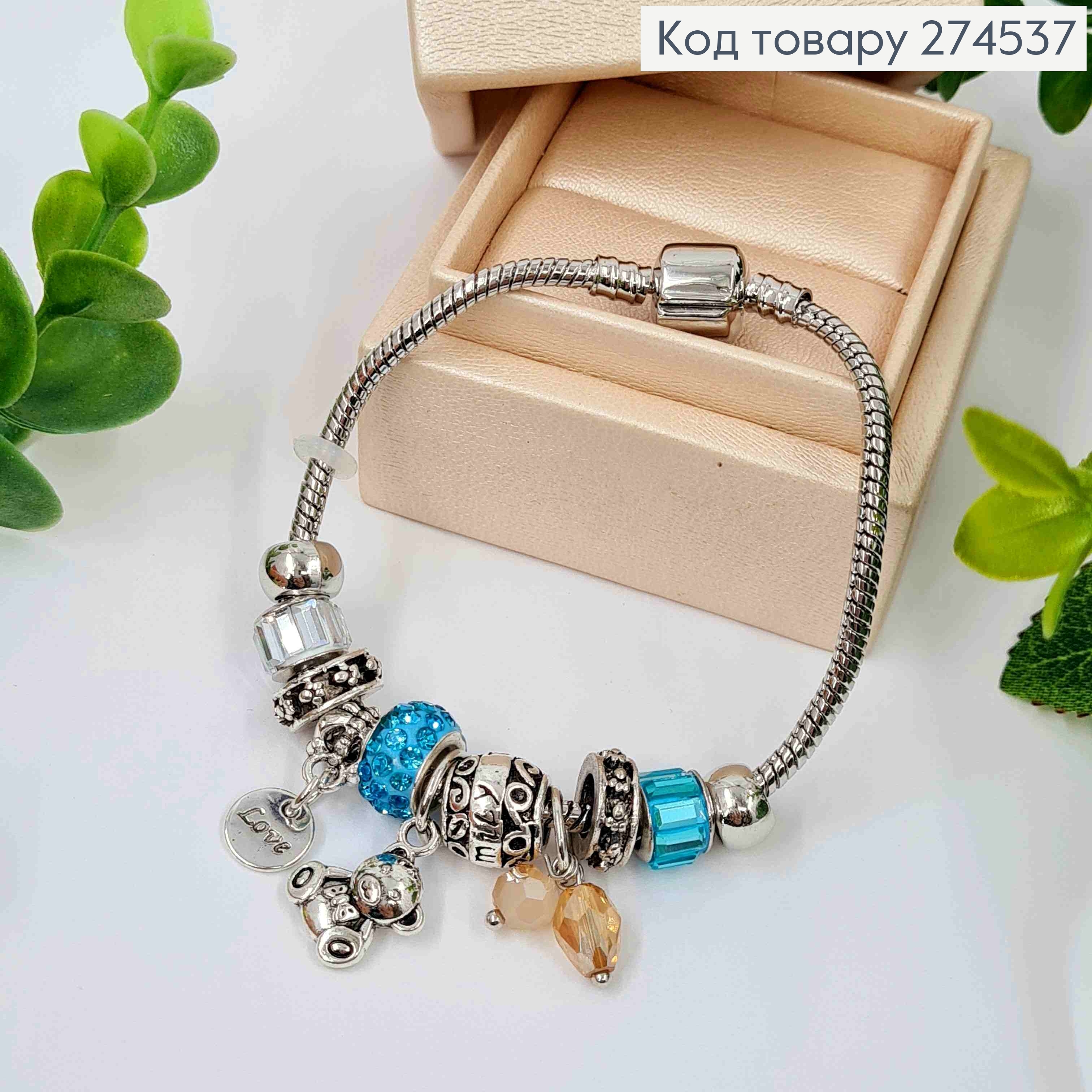 Браслет "ПАНДОРА", шармик с Голубым камнем + (Love/Мишка/Бусины), серебряного цвета, бижутерия