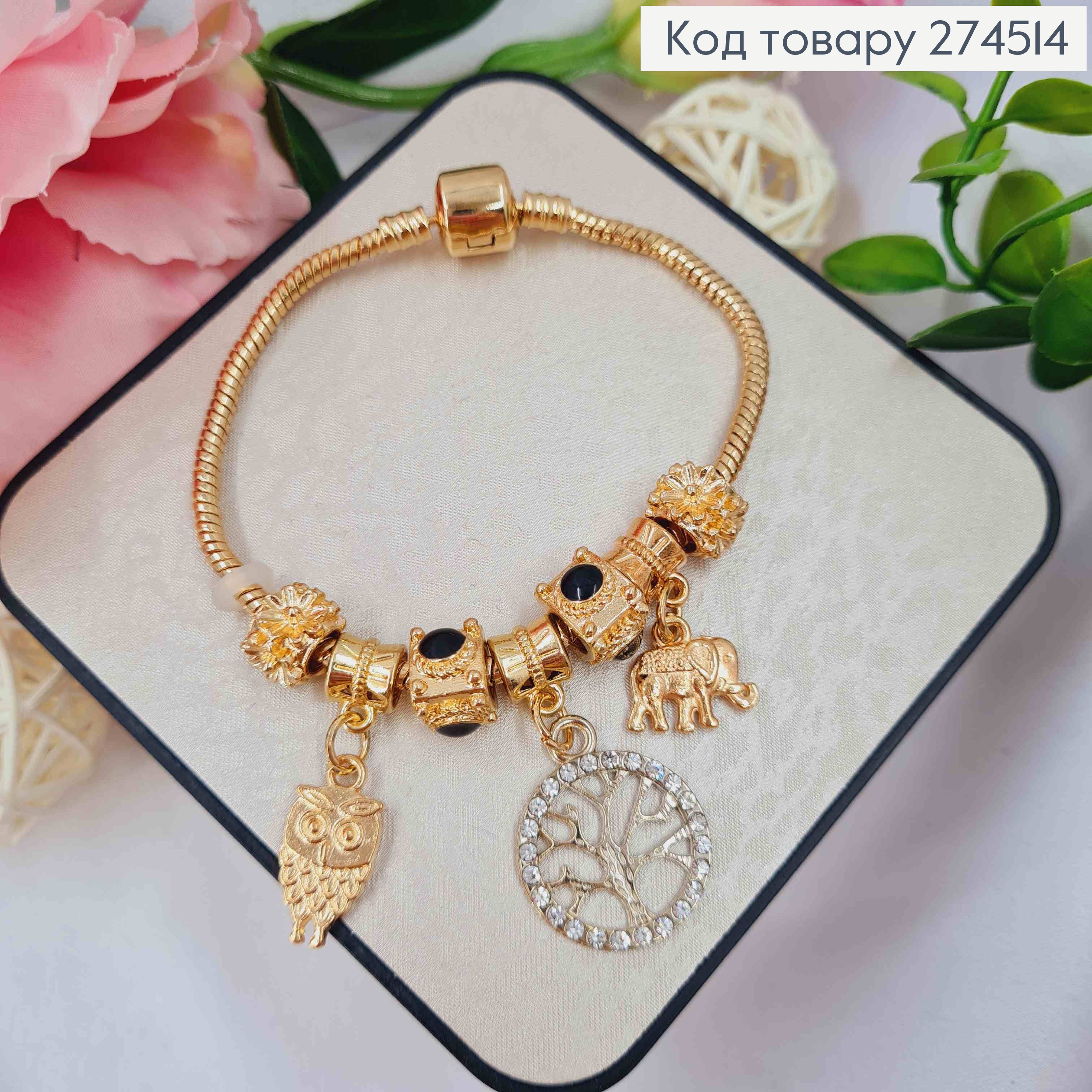 Браслет "ПАНДОРА", шармик с черным камнем + (Дерево/Сова/Слон), золотого цвета, бижутерия