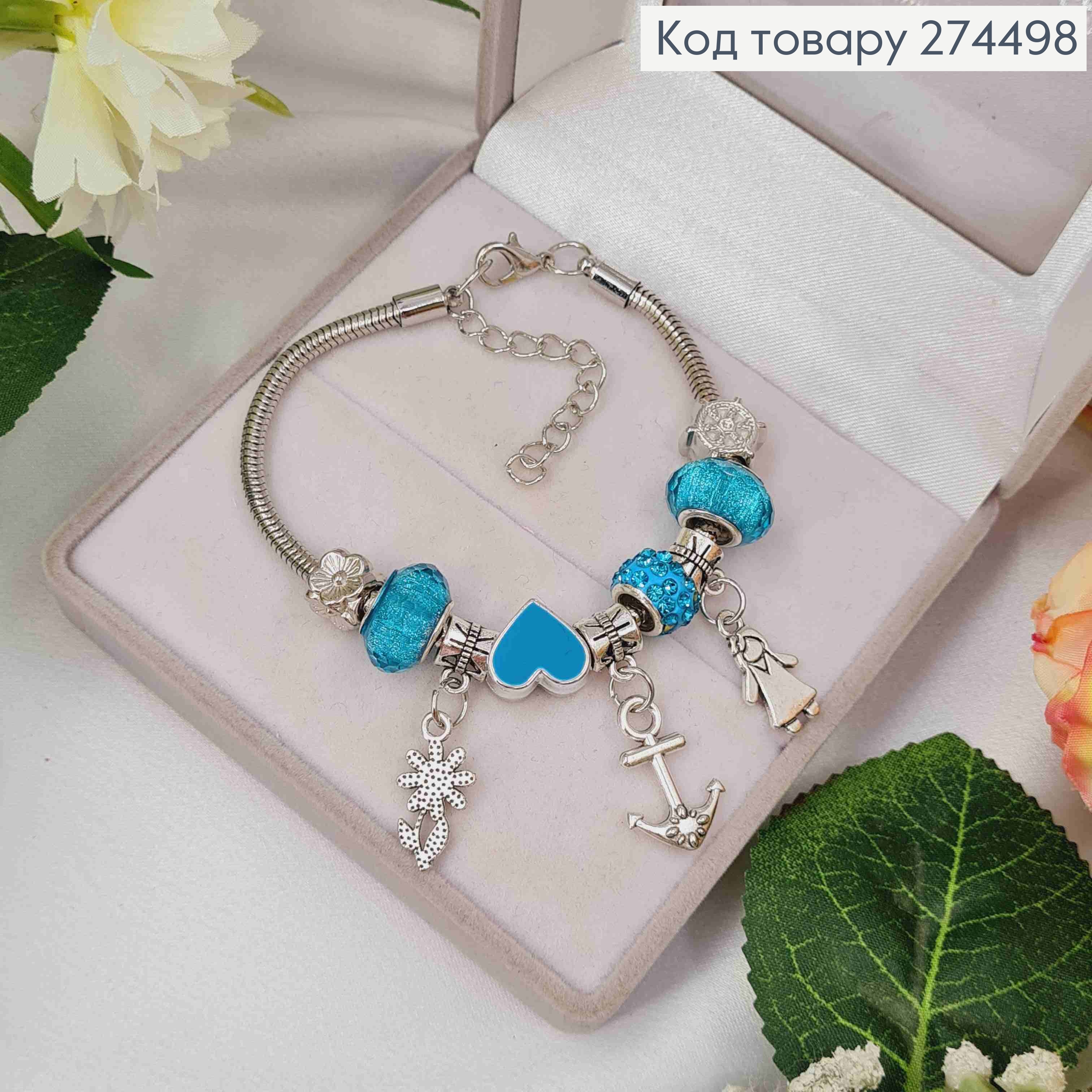 Браслет "ПАНДОРА" с Голубой шармиком (Девочка-Цветок-Якир), серебряного цвета, бижутерия