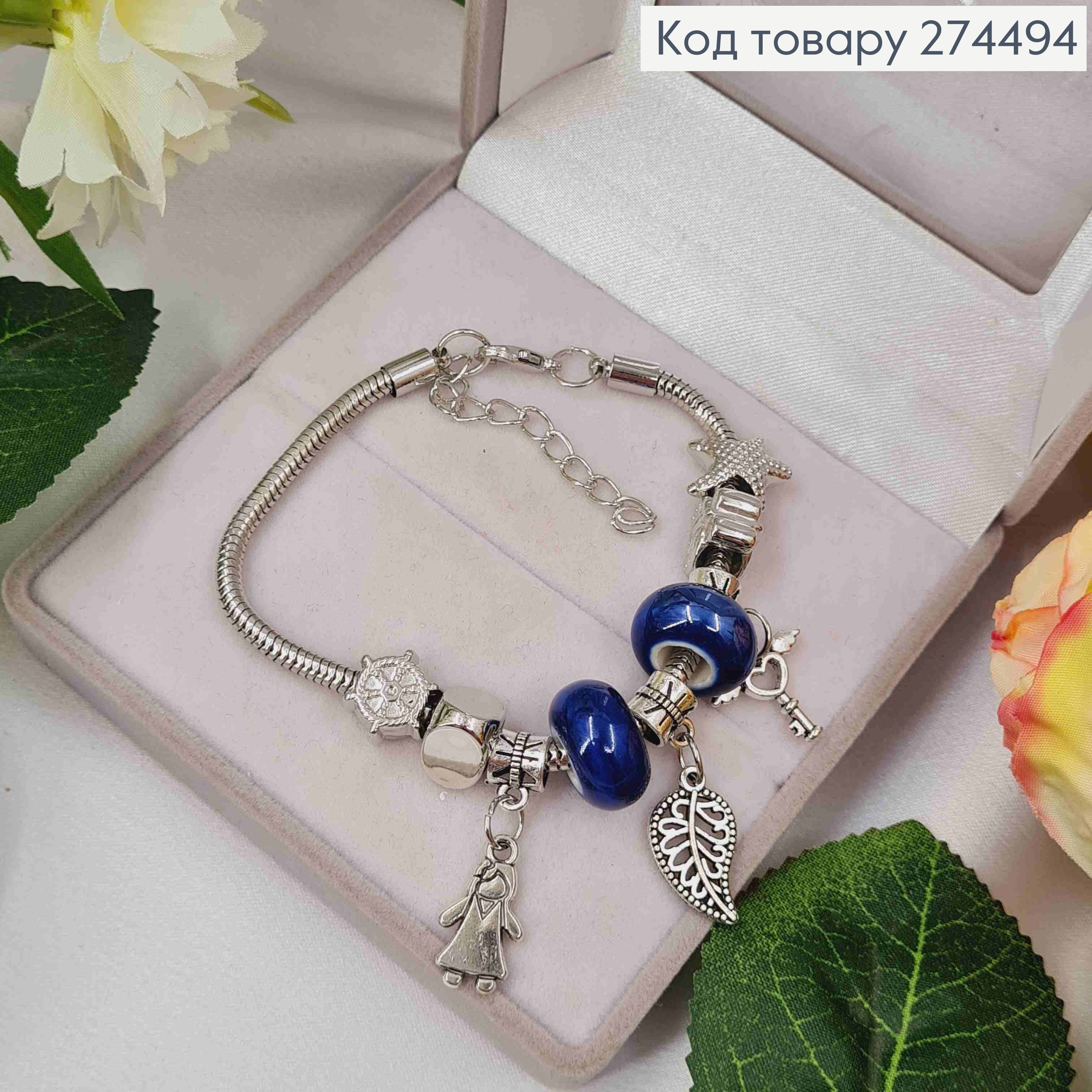 Браслет "ПАНДОРА" с Фиолетовым шармиком (Ключ-Девочка-Листочек), серебряного цвета, бижутерия.