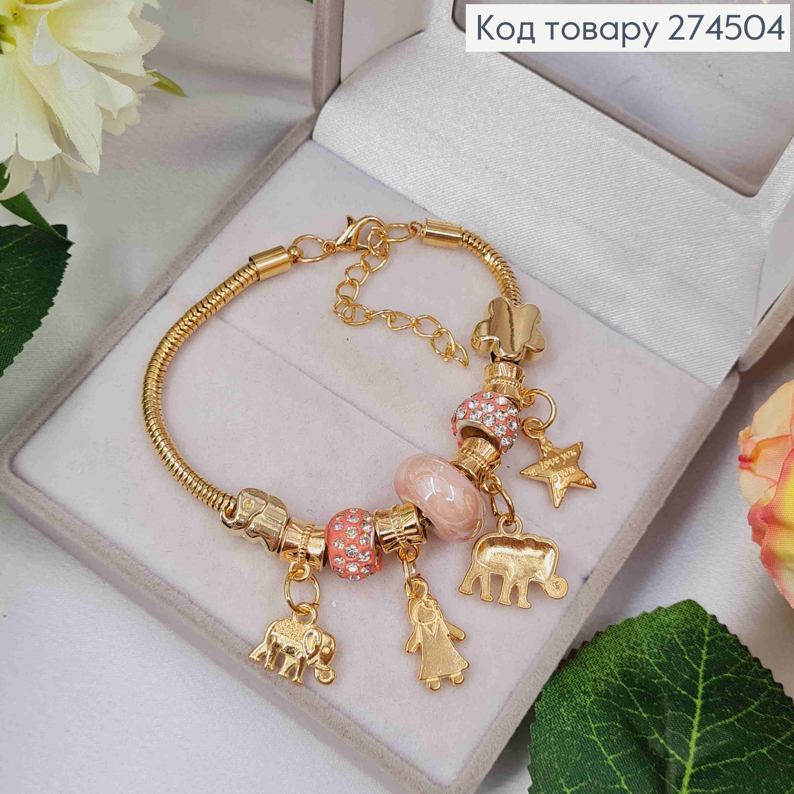Браслет "ПАНДОРА" с розовым шармиком и подвесками (Звезда-Слоны-Кукла), золотого цвета, бижутерия.