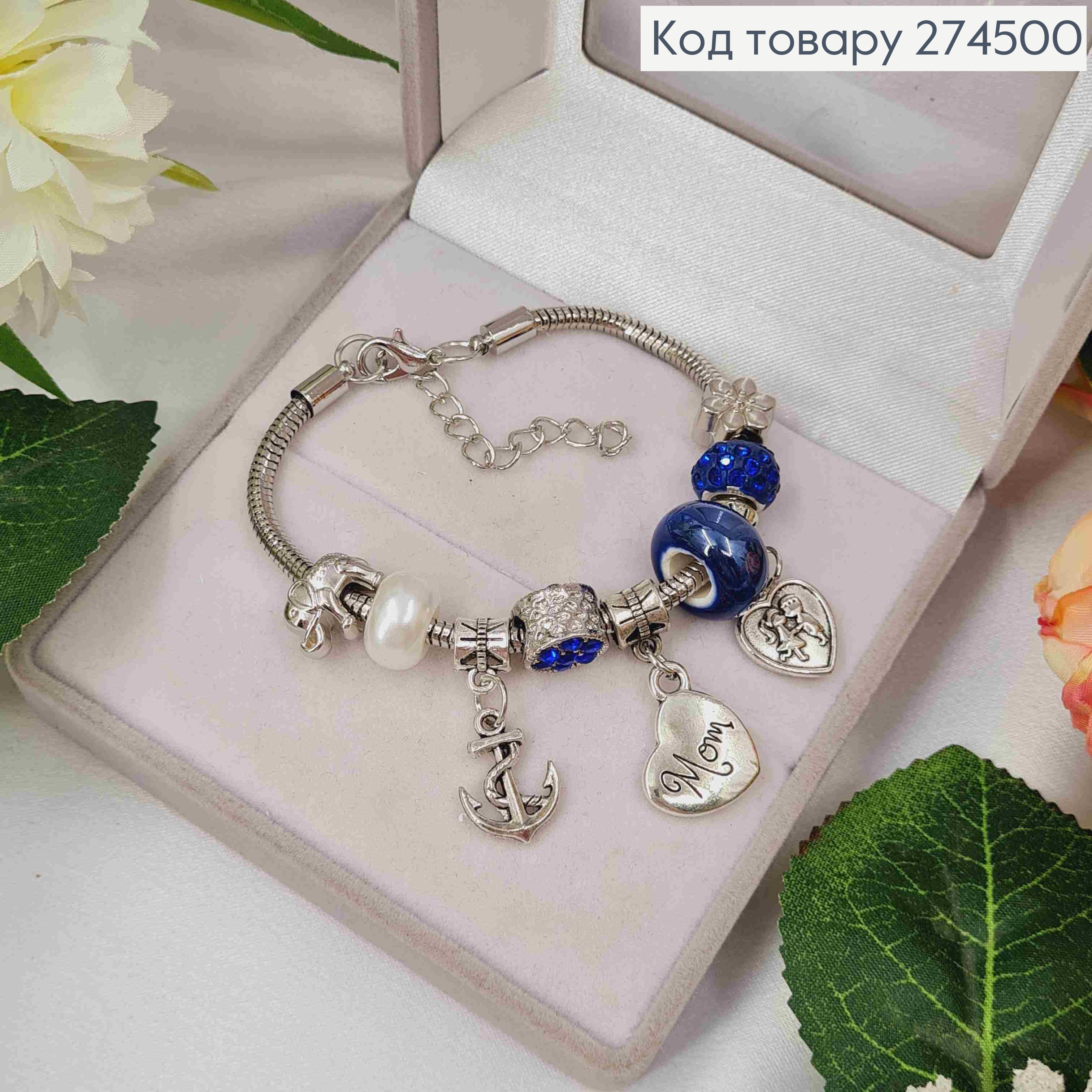 Браслет "ПАНДОРА" с Синим шармиком и подвесками (Сердца-Якир), серебряного цвета, бижутерия.