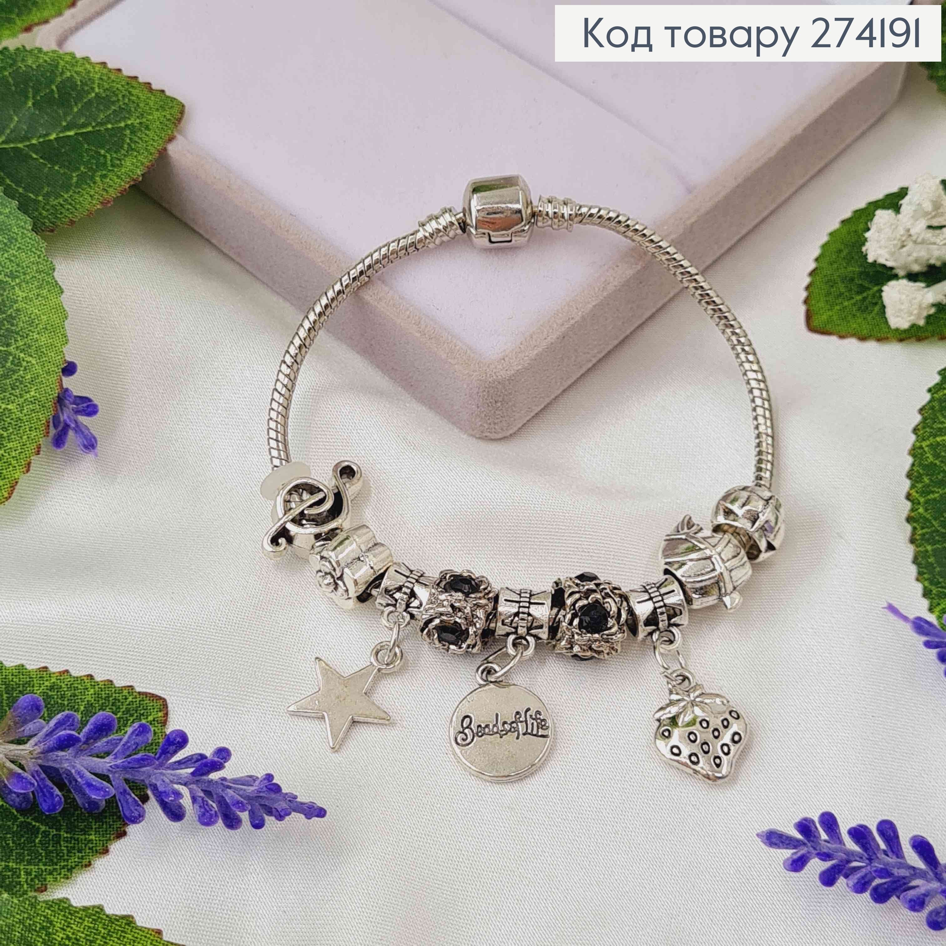 Браслет под Пандору 18см, серебряного цвета с черными шармиками.