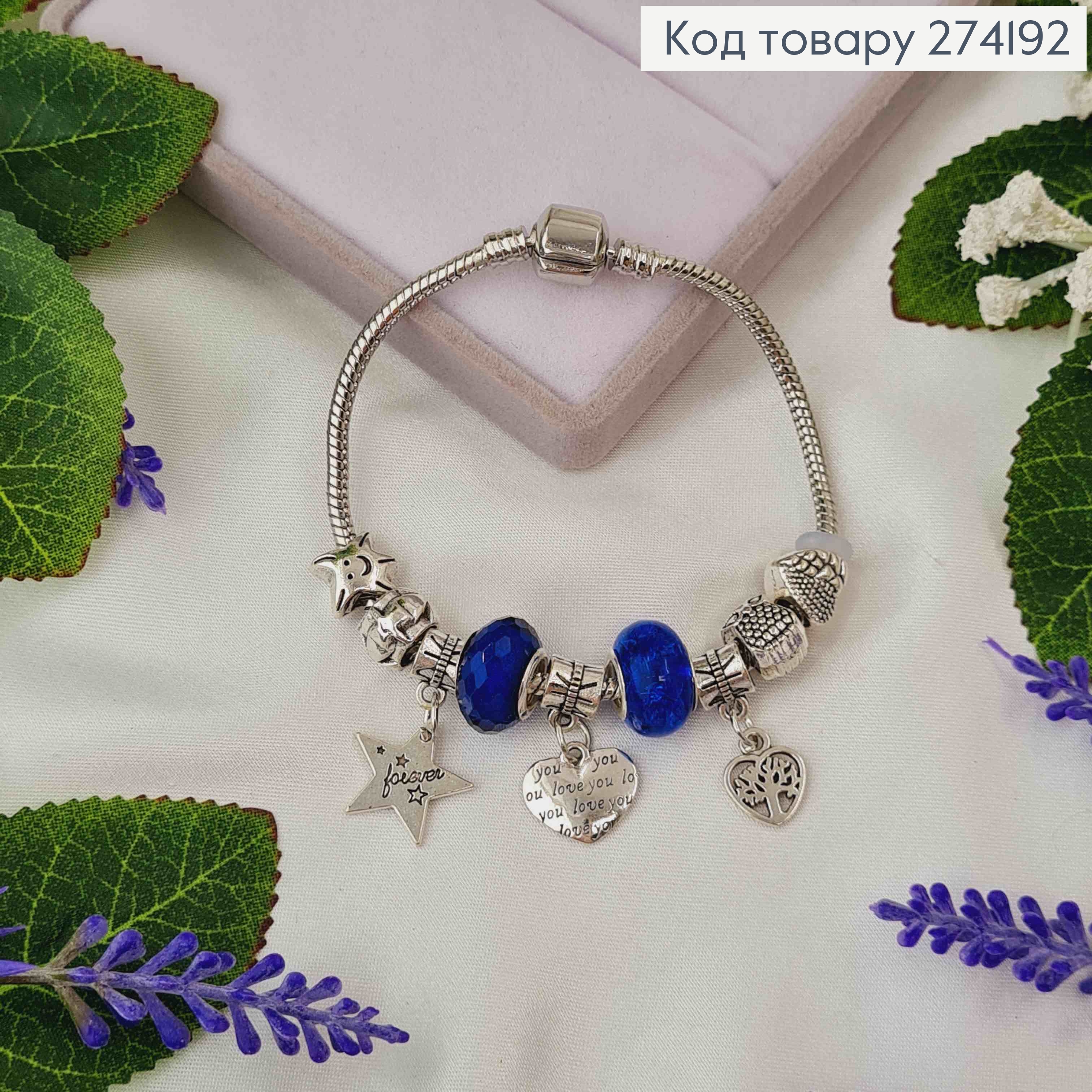 Браслет под Пандору 18см, серебряного цвета с синими шармиками.