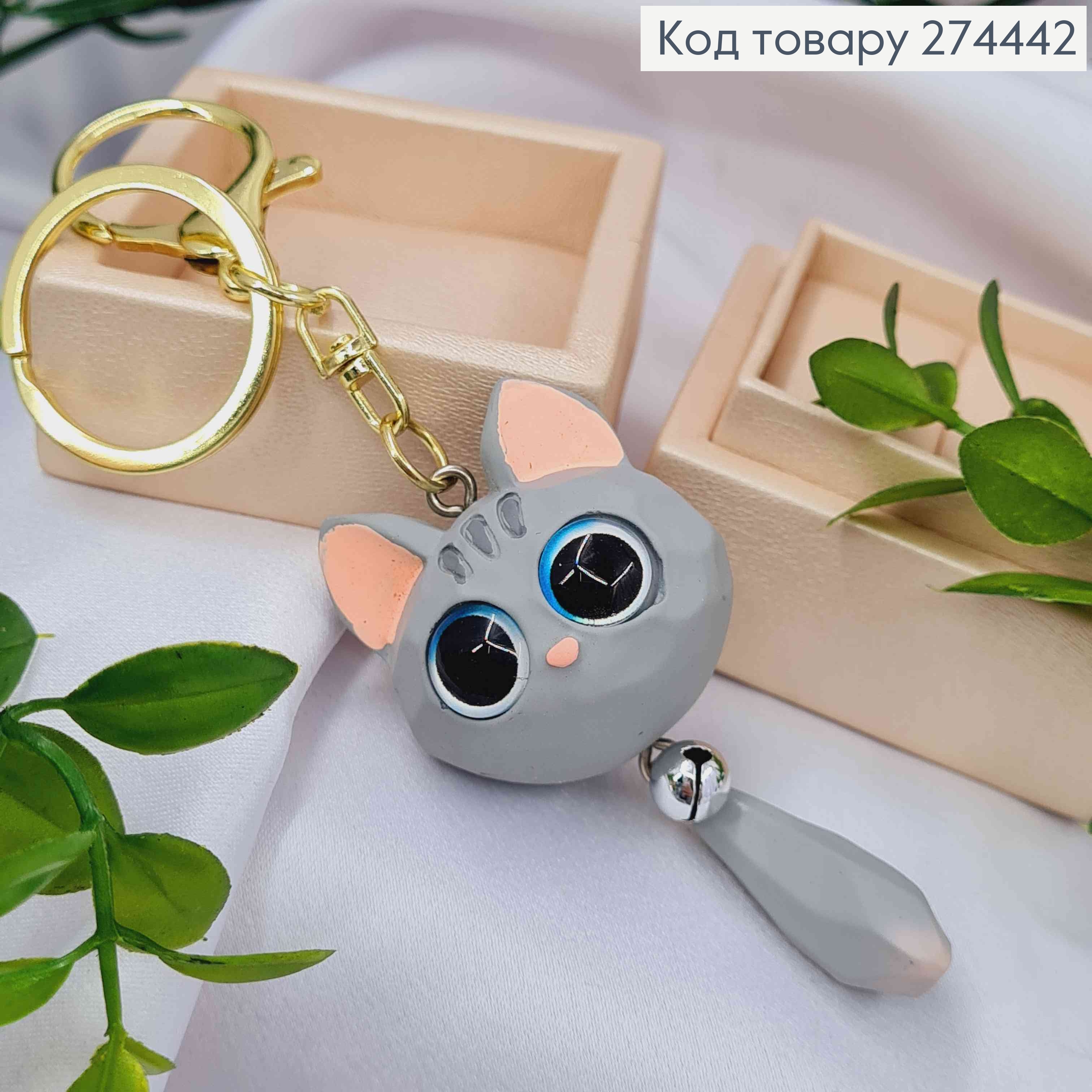 Брелок "Котик" с Колокольчиком, 7см, Серого цвета, на карабине и кольце