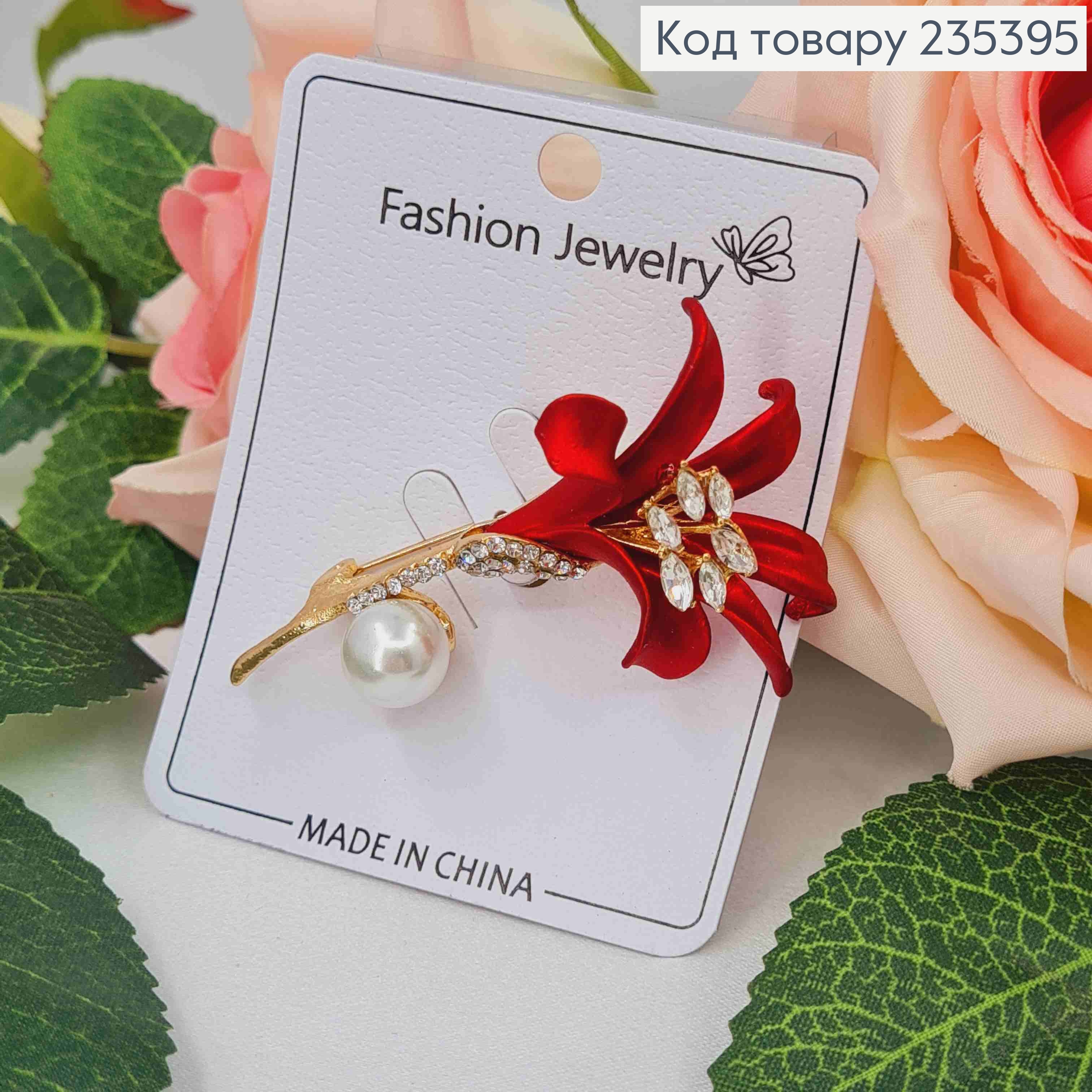 Брошь, "Цветок Лилии" Красного цвета с камешками и жемчужиной, 6см, Золотого цвета