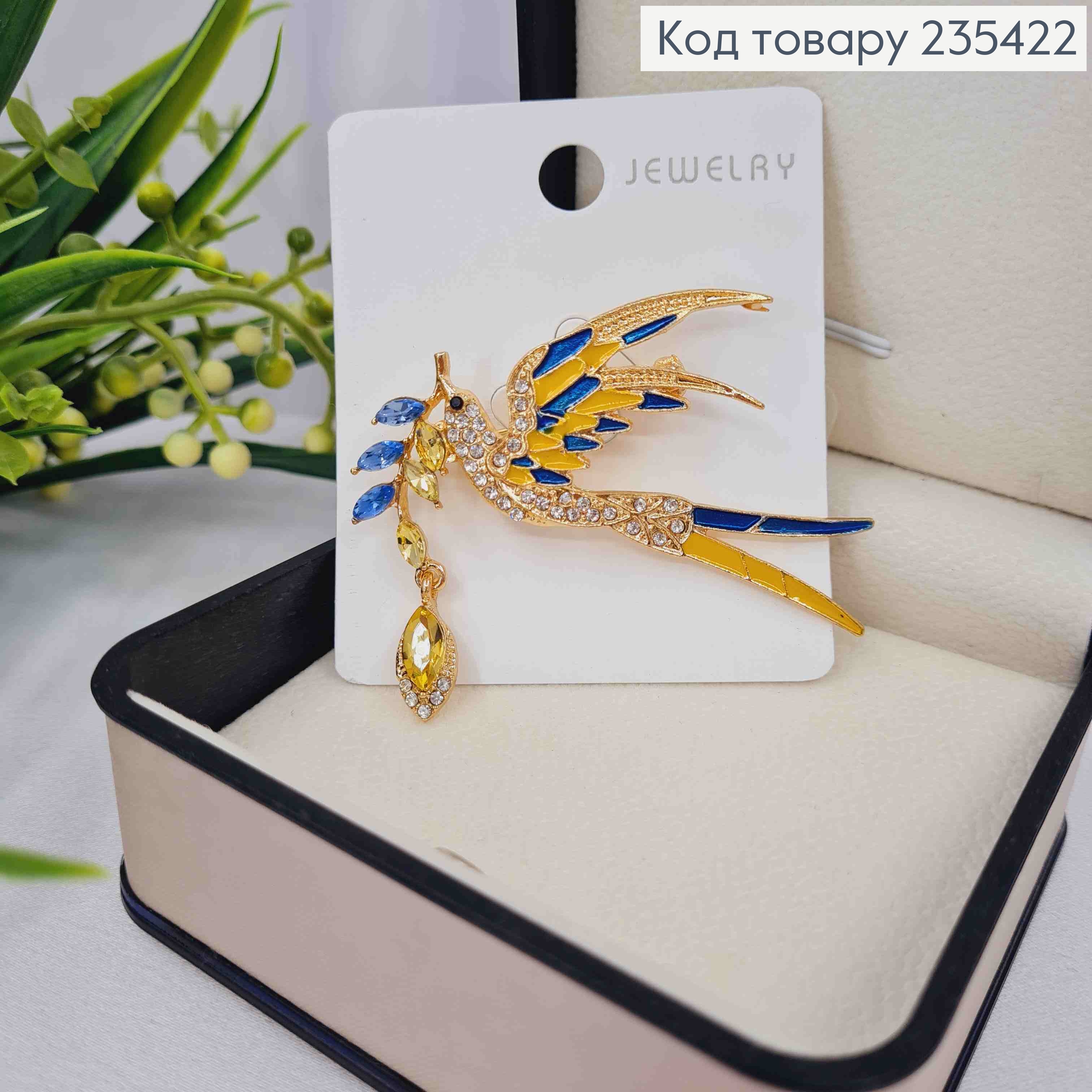 Брошь, "Ласточка" украшена камнями с Желто-Синей эмалью, 6,5см, Золотого цвета