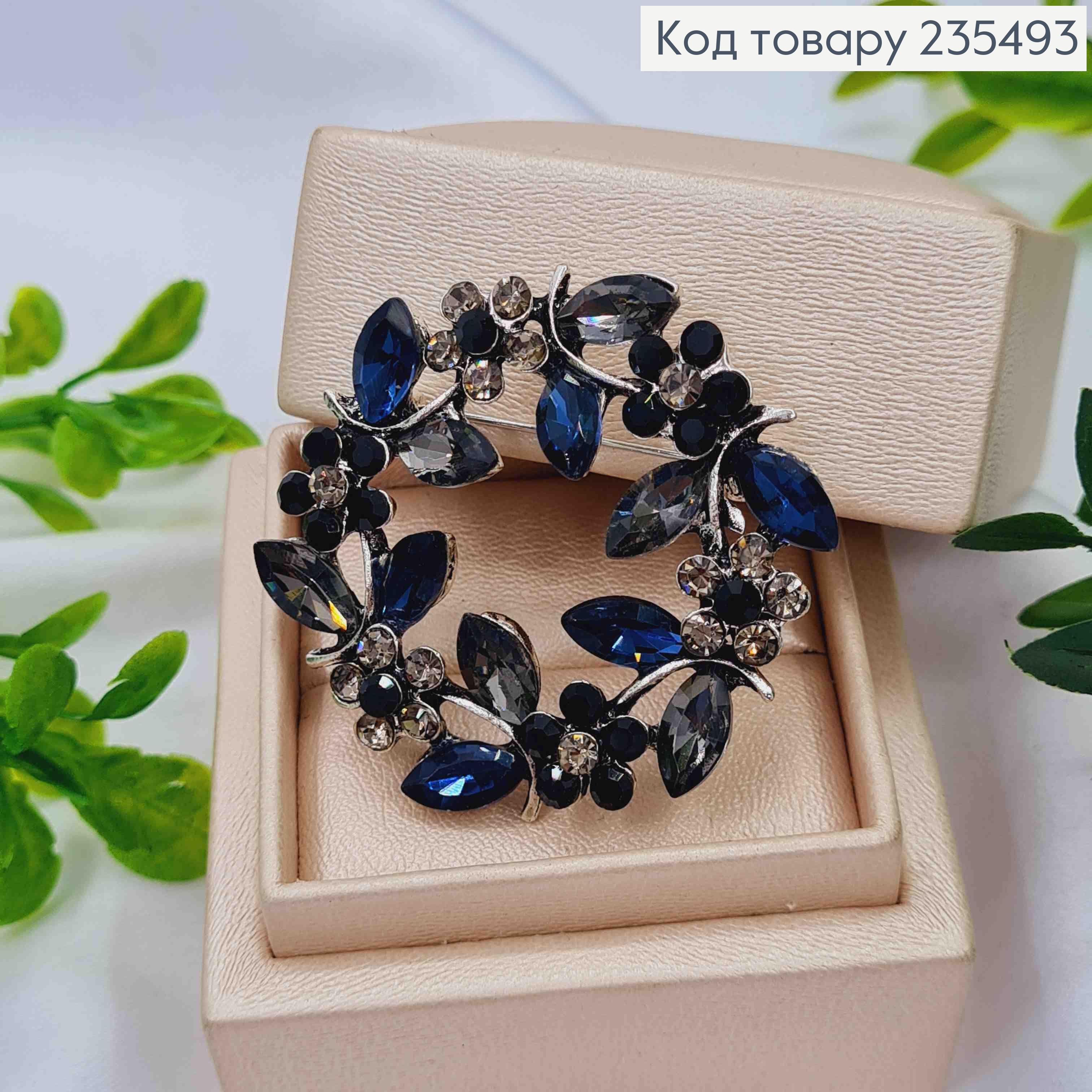 Брошь металл, "Цветочный венчик" с графитовыми и синими камешками, диаметр 4см.