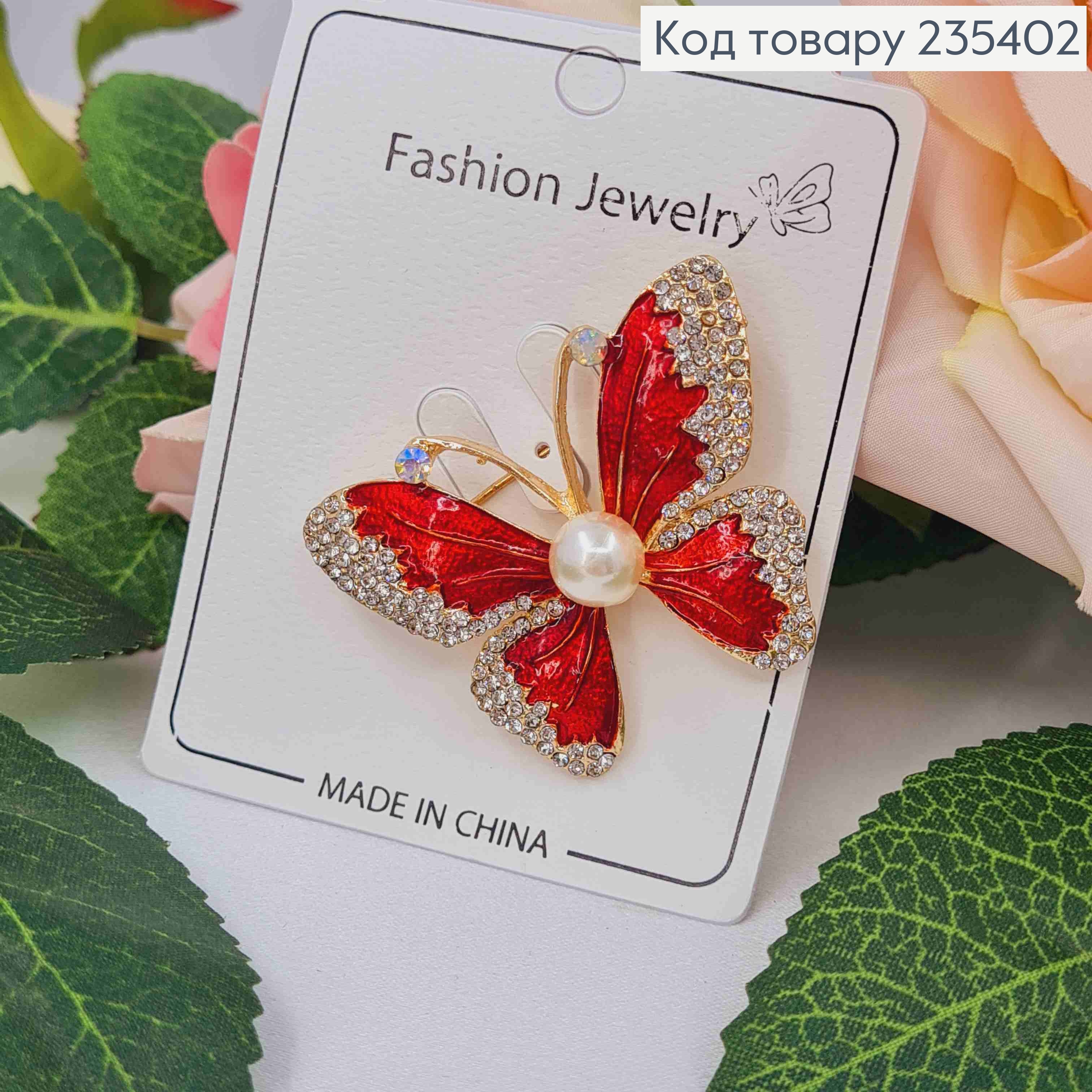 Брошь, "Бабочка" с Блестящими камешками и Жемчужкой, 4,5см, Красного цвета