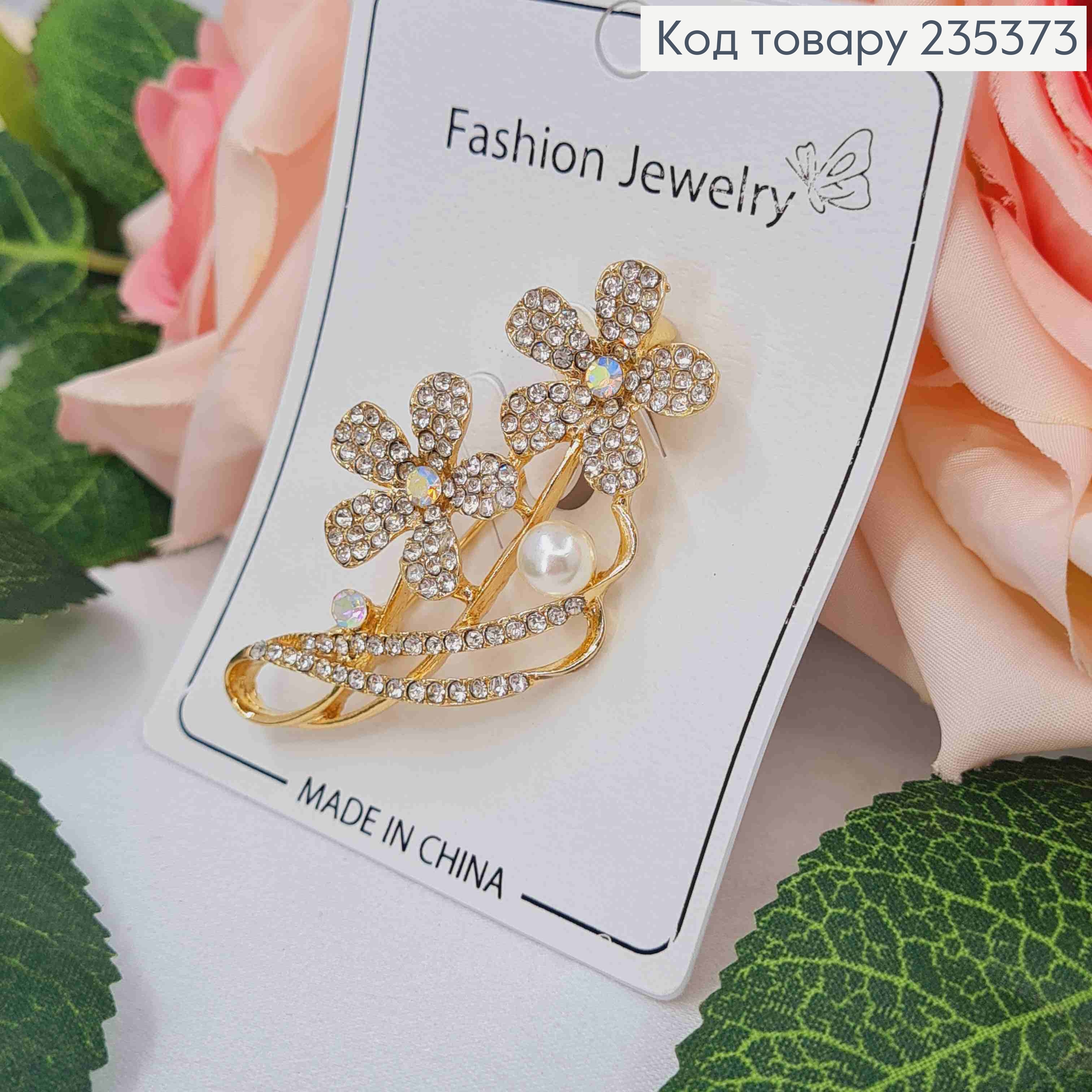 Брошь, "Мини Цветочки" с Блестящими камешками и Жемчужкой, 5см, Золотого цвета