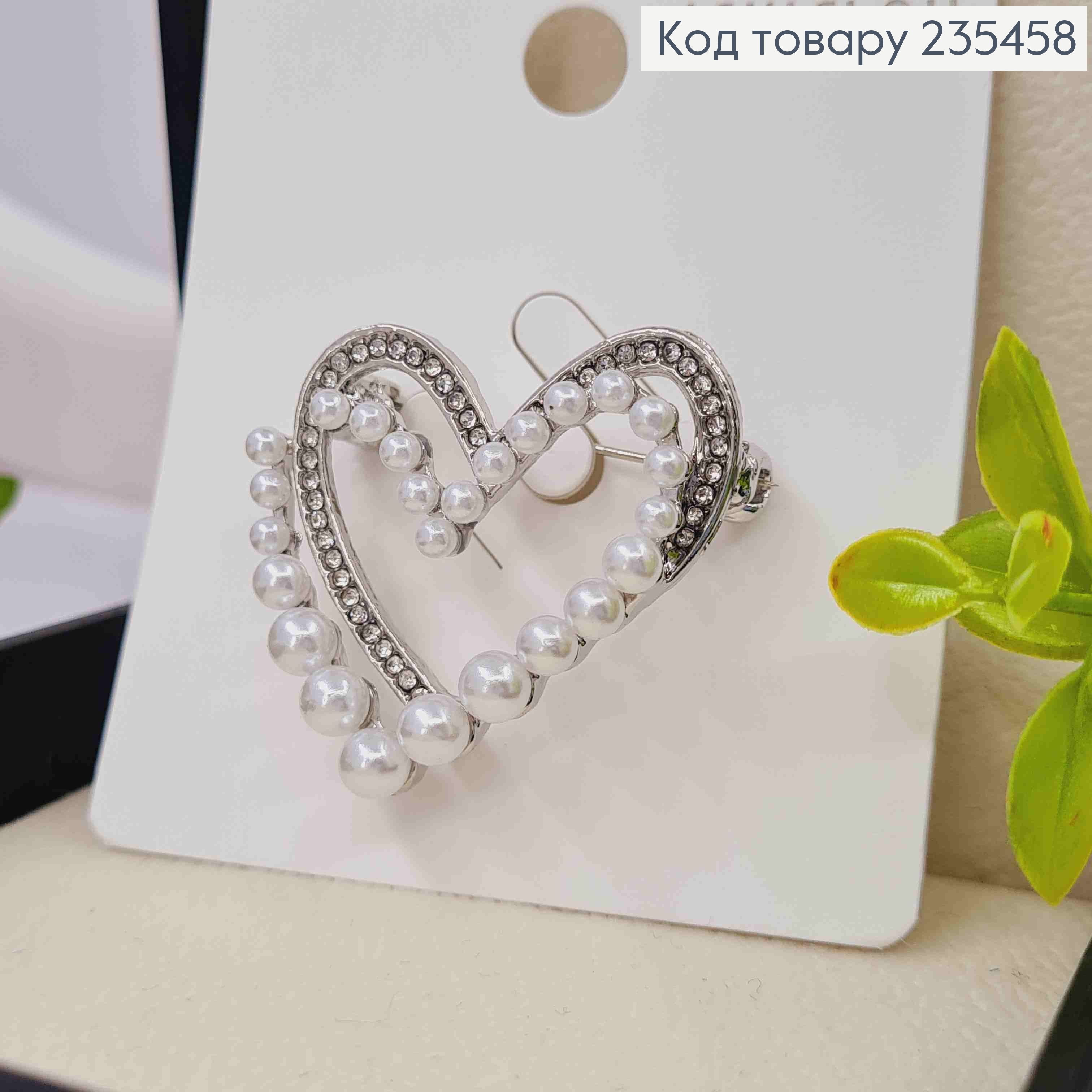 Брошь "СЕРДЦЕ" с Блестящими камешками и Жемчужками, 3,5*4см, Серебряного цвета