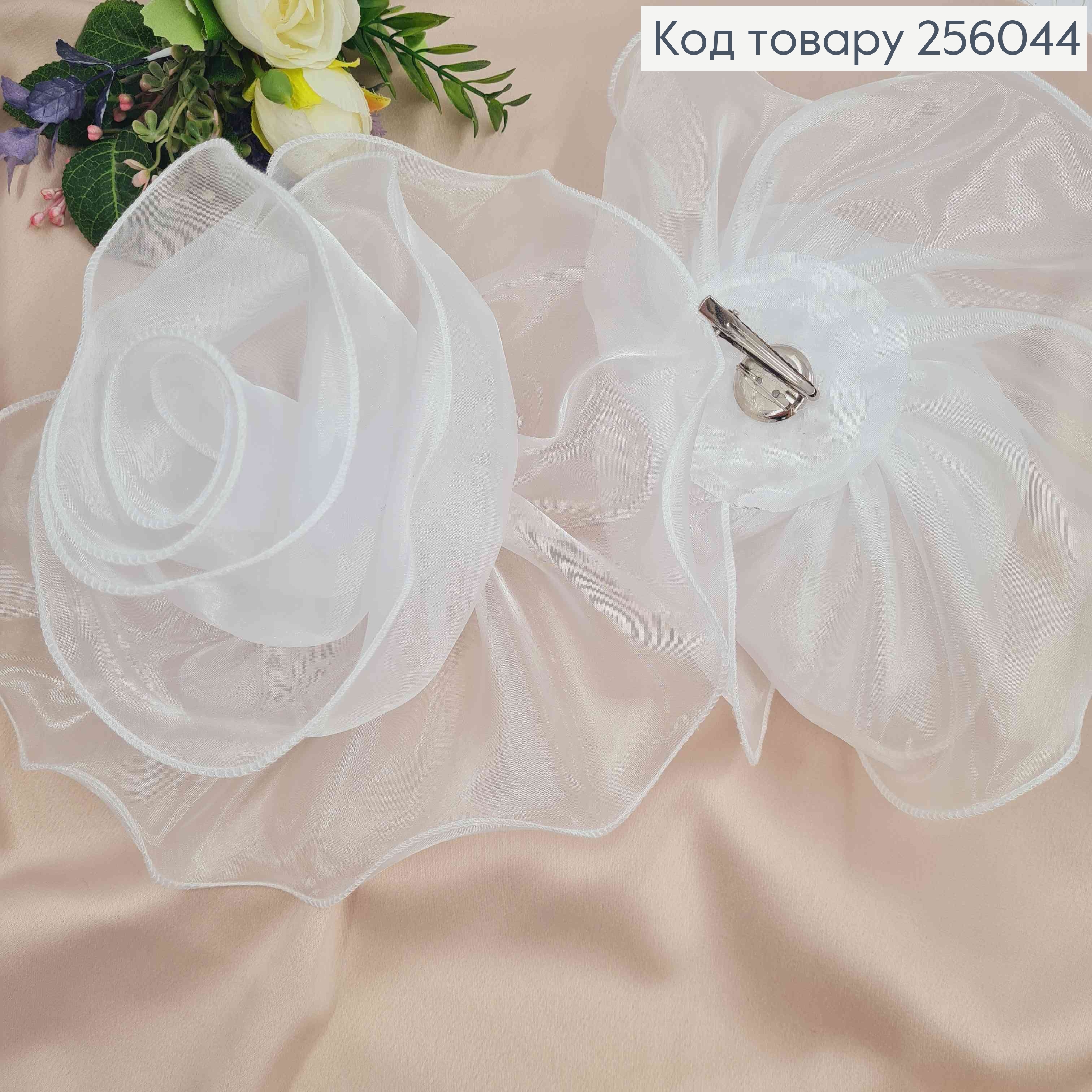 Брошь-заколка, объемный цветок розы БЕЛОГО цвета, 24см, ткань органза кристаллин, ручная работа