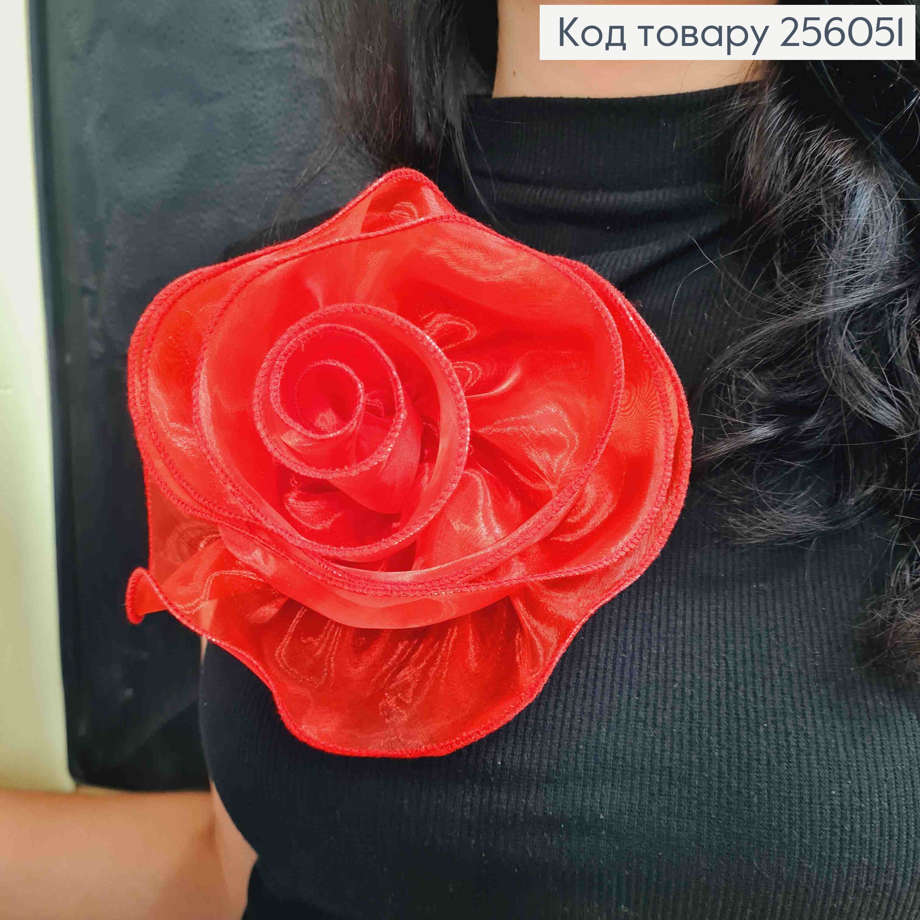 Брошь-заколка, объемная роза КРАСНОГО цвета, 16см, ткань органза кристаллин, ручная работа