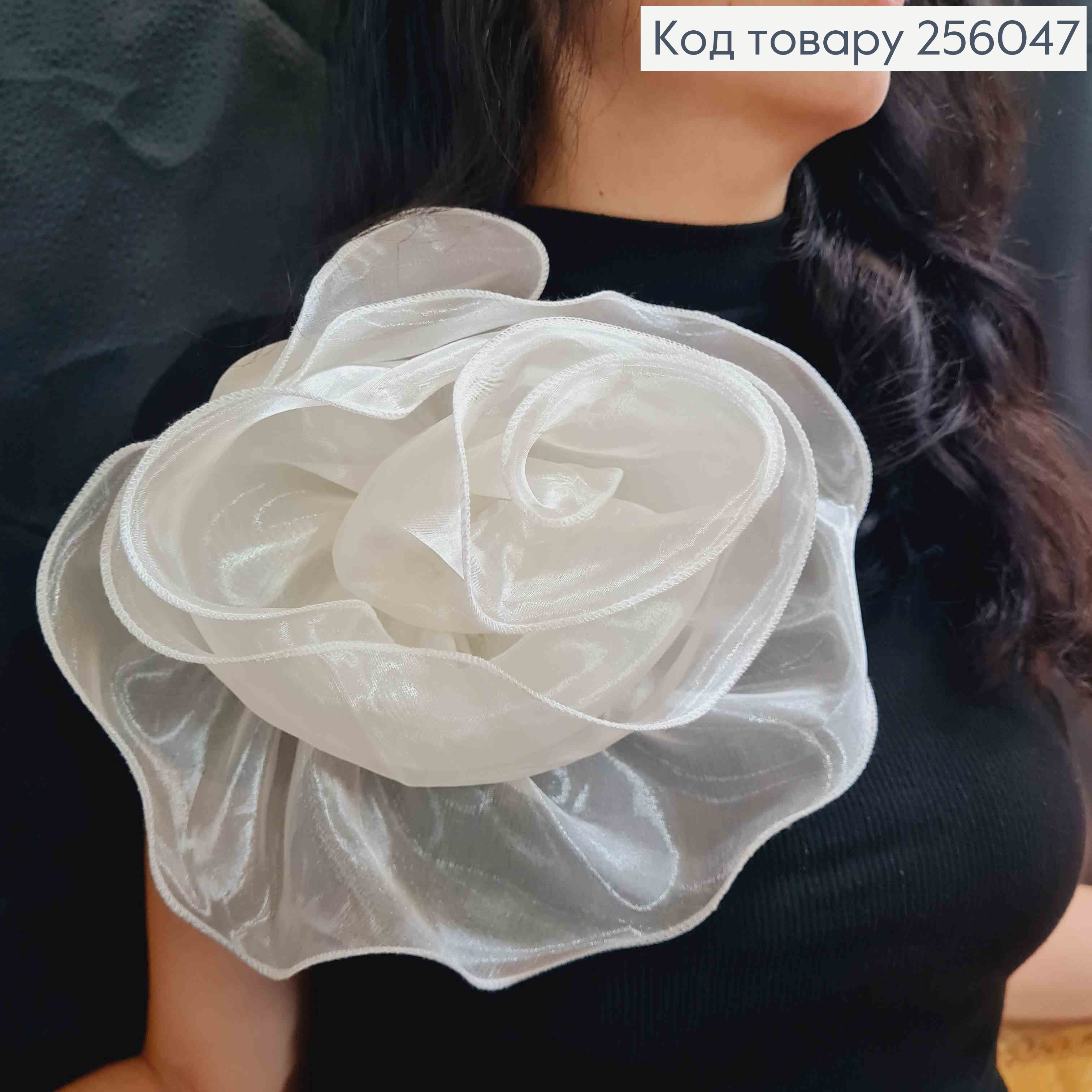 Брошь-заколка, объемная роза цвета АИВОРИ, 24см, ткань органза кристаллин, ручная работа