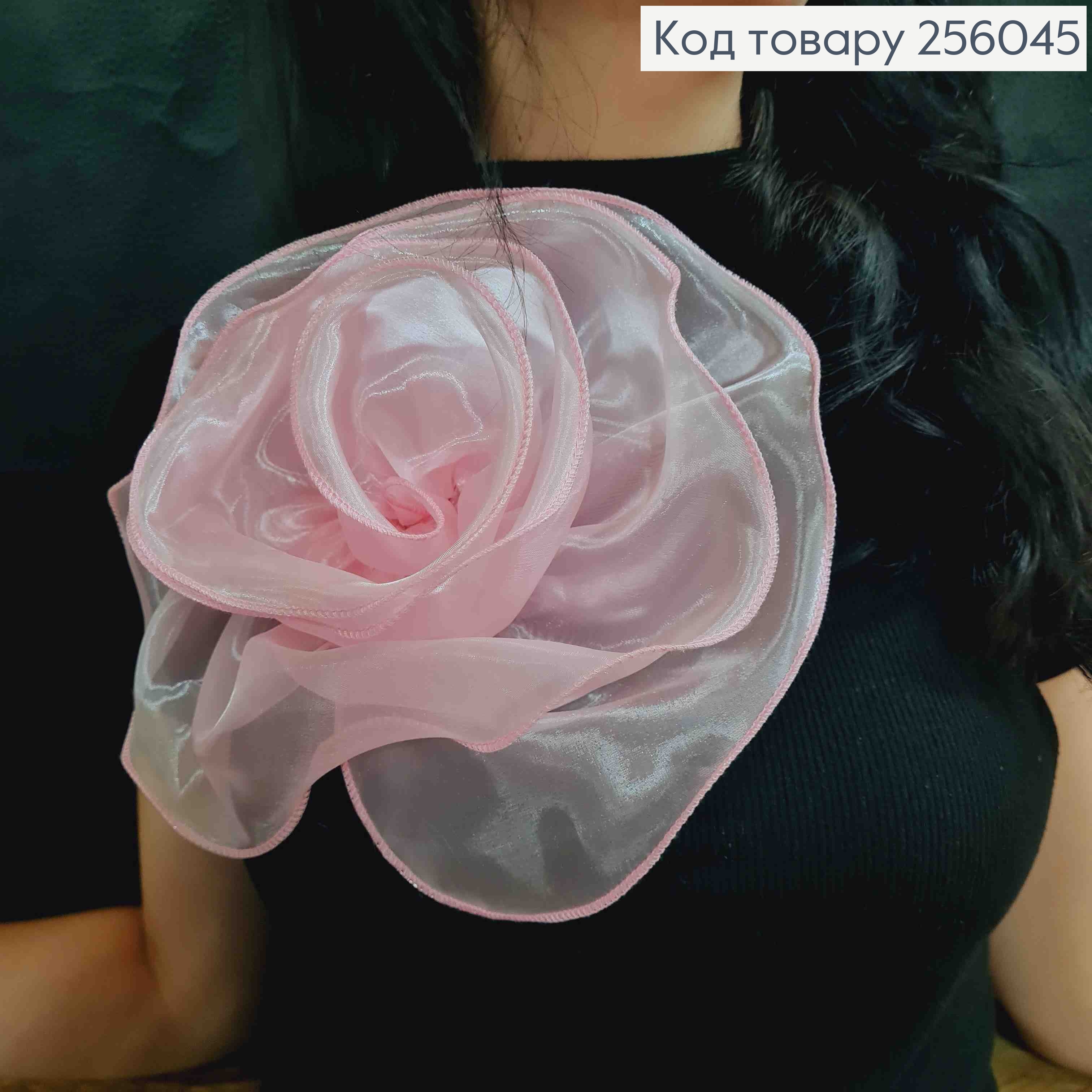 Брошь-заколка, объемная роза РОЗОВОГО цвета, 24см, ткань органза кристаллин, ручная работа