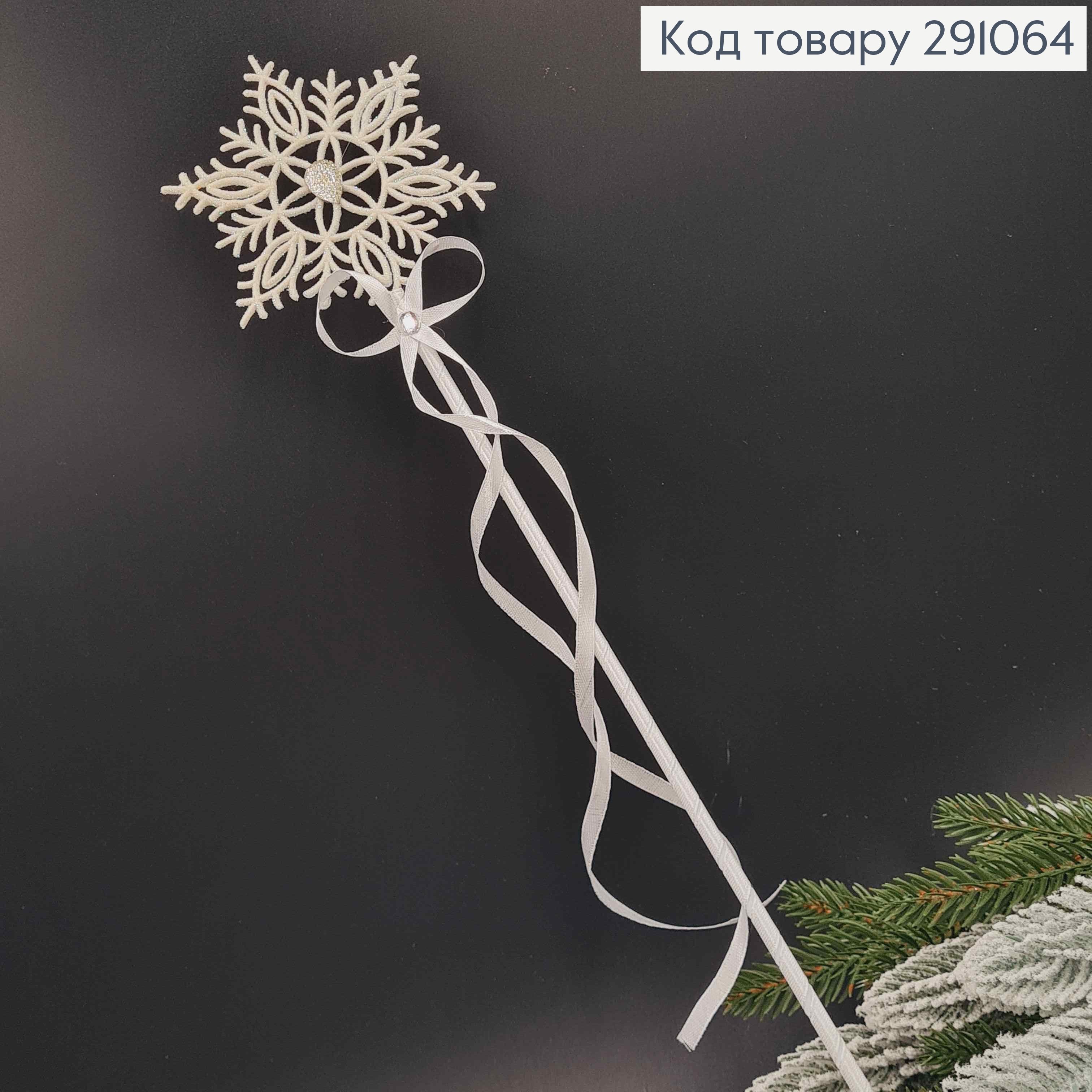 Волшебная палочка, блестящая Снежинка с серединкой в камнях, обтянутая ленточкой, в белых тонах, длина, 44см