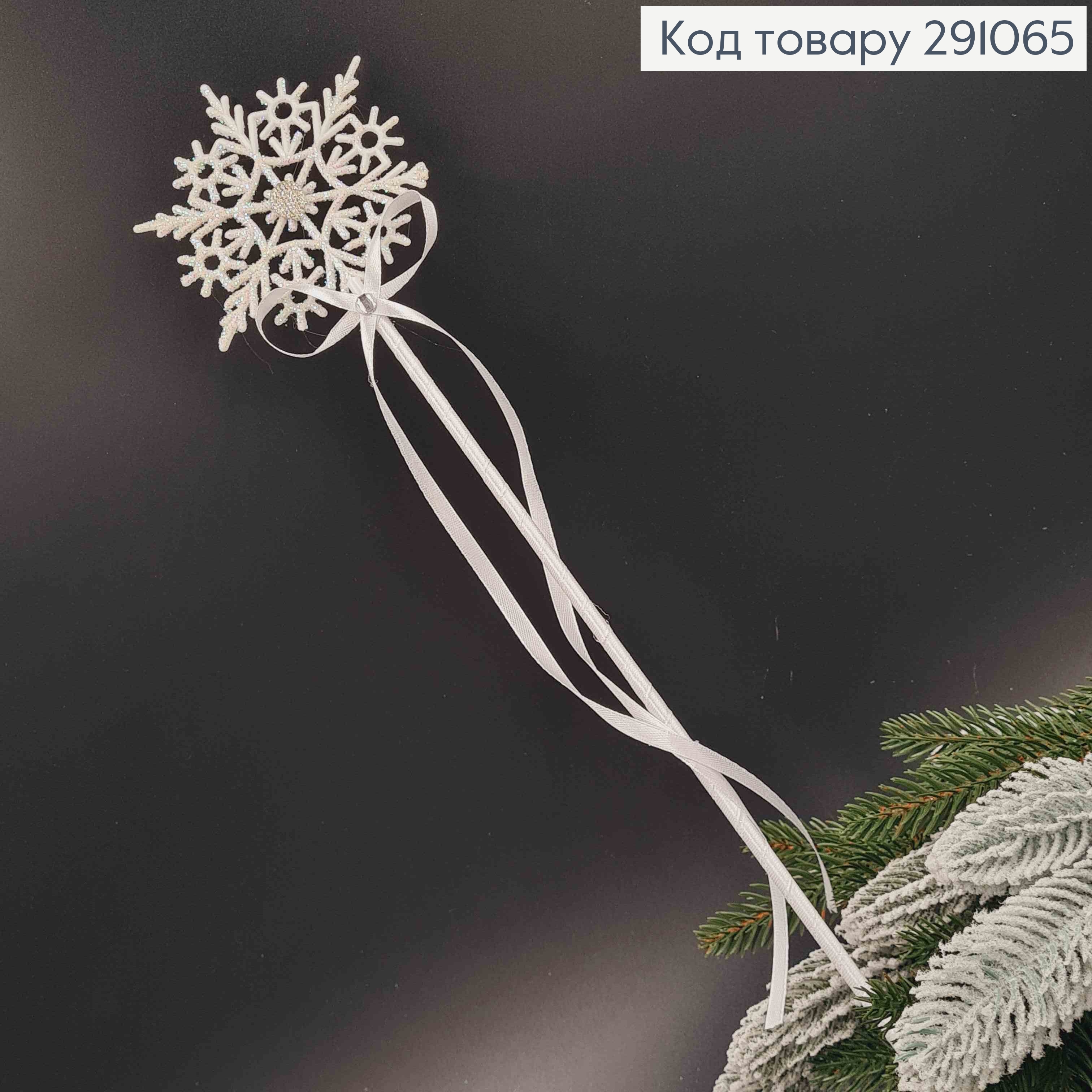 Волшебная палочка, блестящая Снежинка с серединкой в камнях, обтянутая ленточкой, в белых тонах, длина, 44см