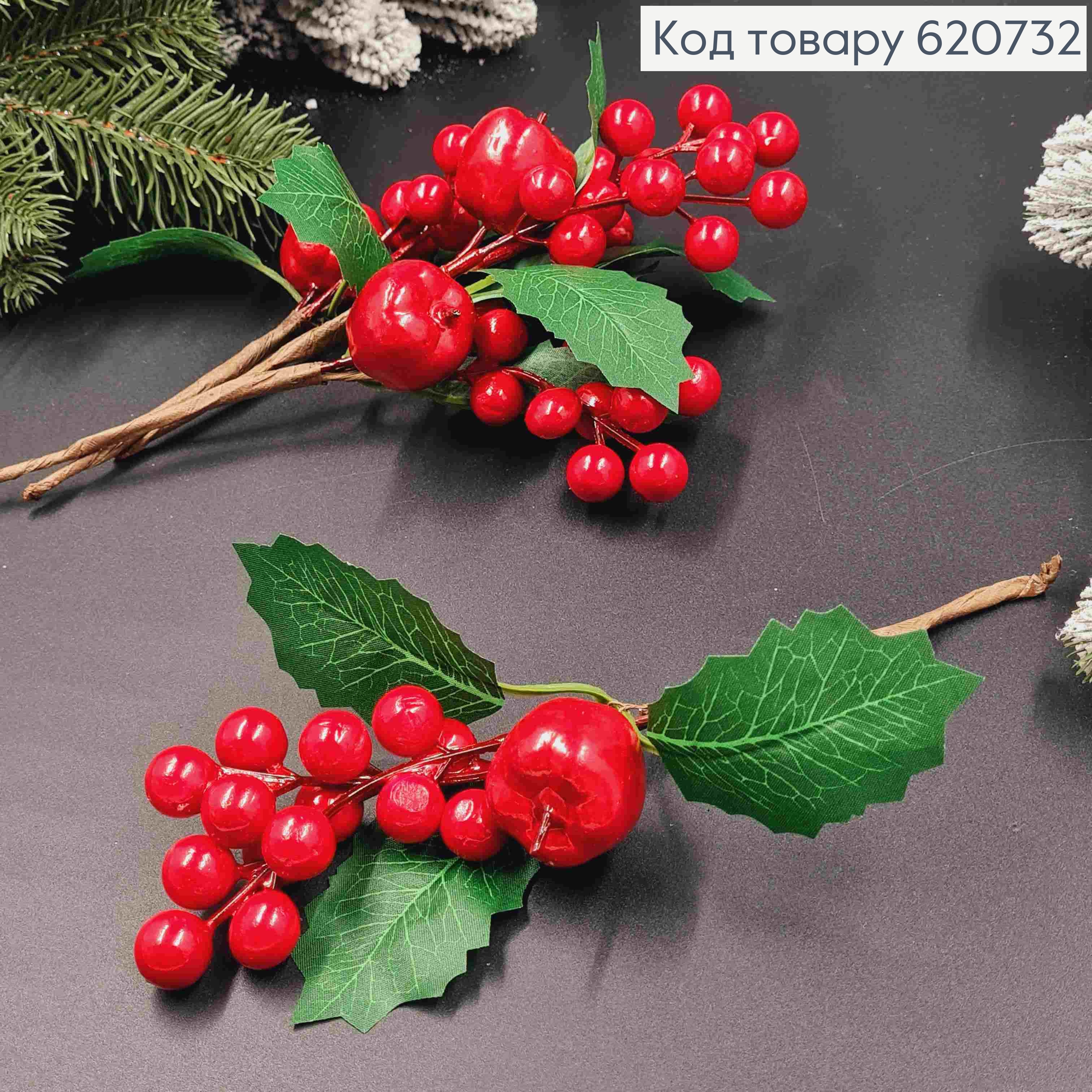 Декор Новогодний, веточка с Красными Ягодками и Яблочком, 20см