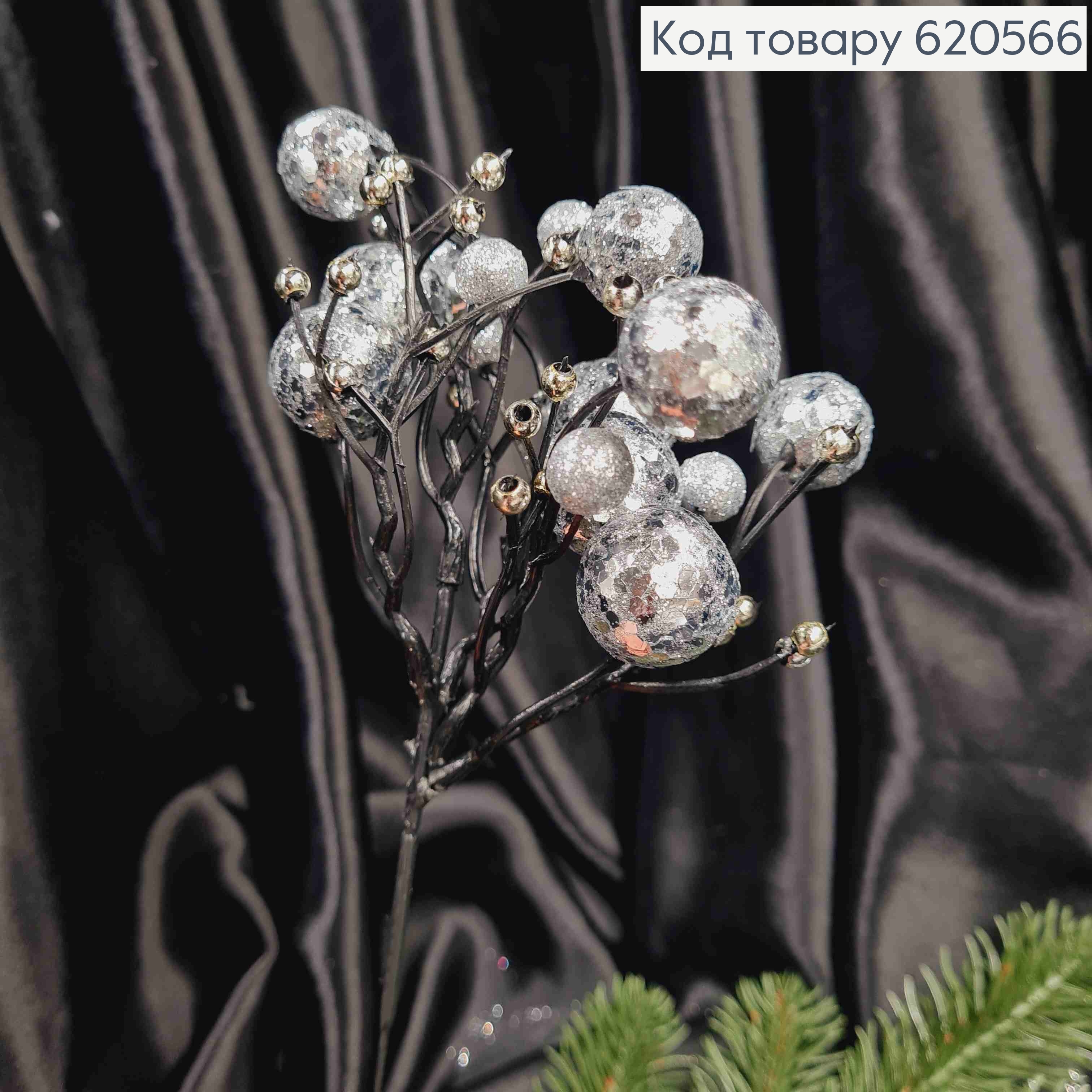 Декор Новогодний, веточка с шариками, СЕРЕБРЯНОГО цвета, 23см на металлической ножке