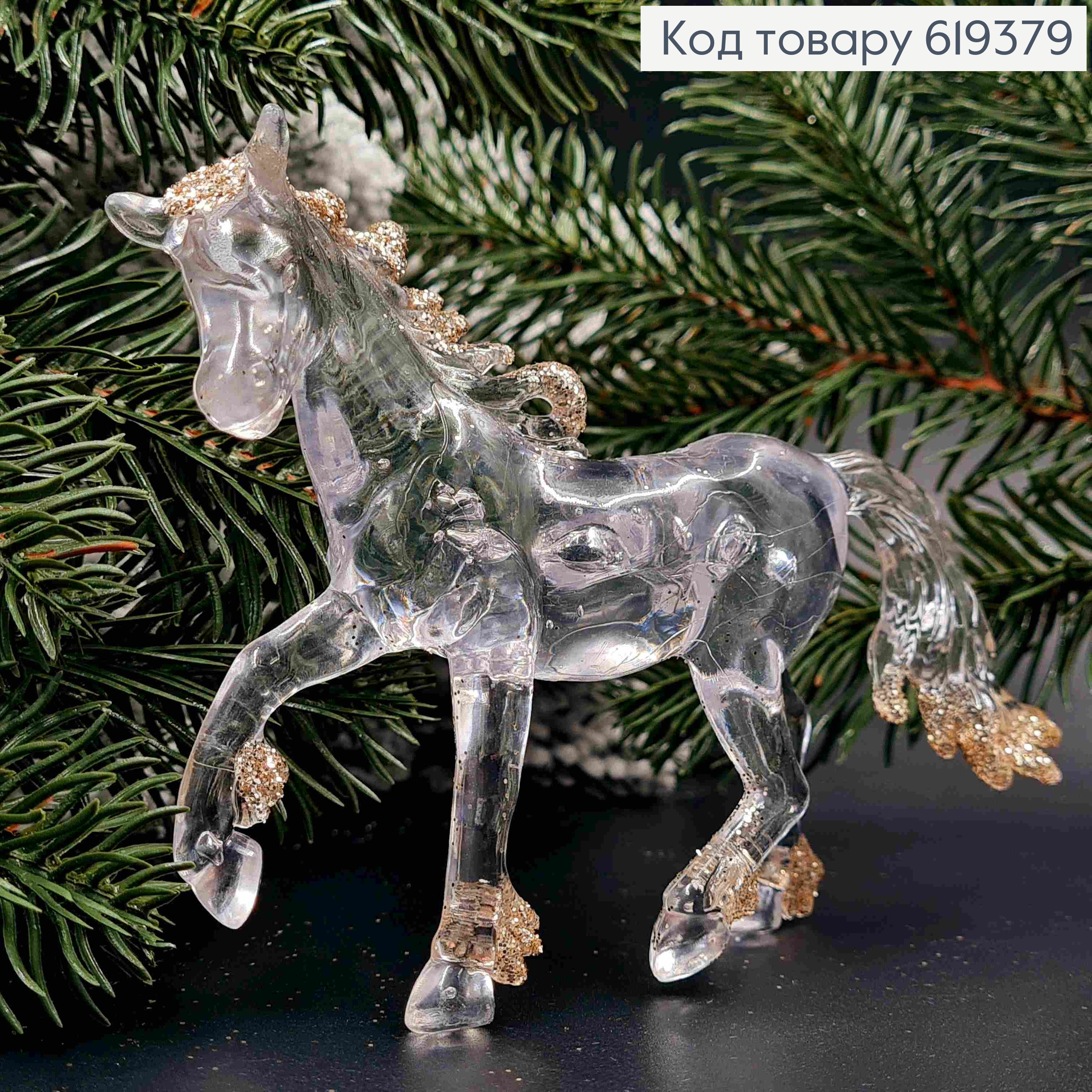 Фигурка "КОНЬ", ПРОЗРАЧНЫЙ с ГРАФИТОВЫМ блеском, 13*10см, новогоднее украшение, пластик,Украина 619381 фото