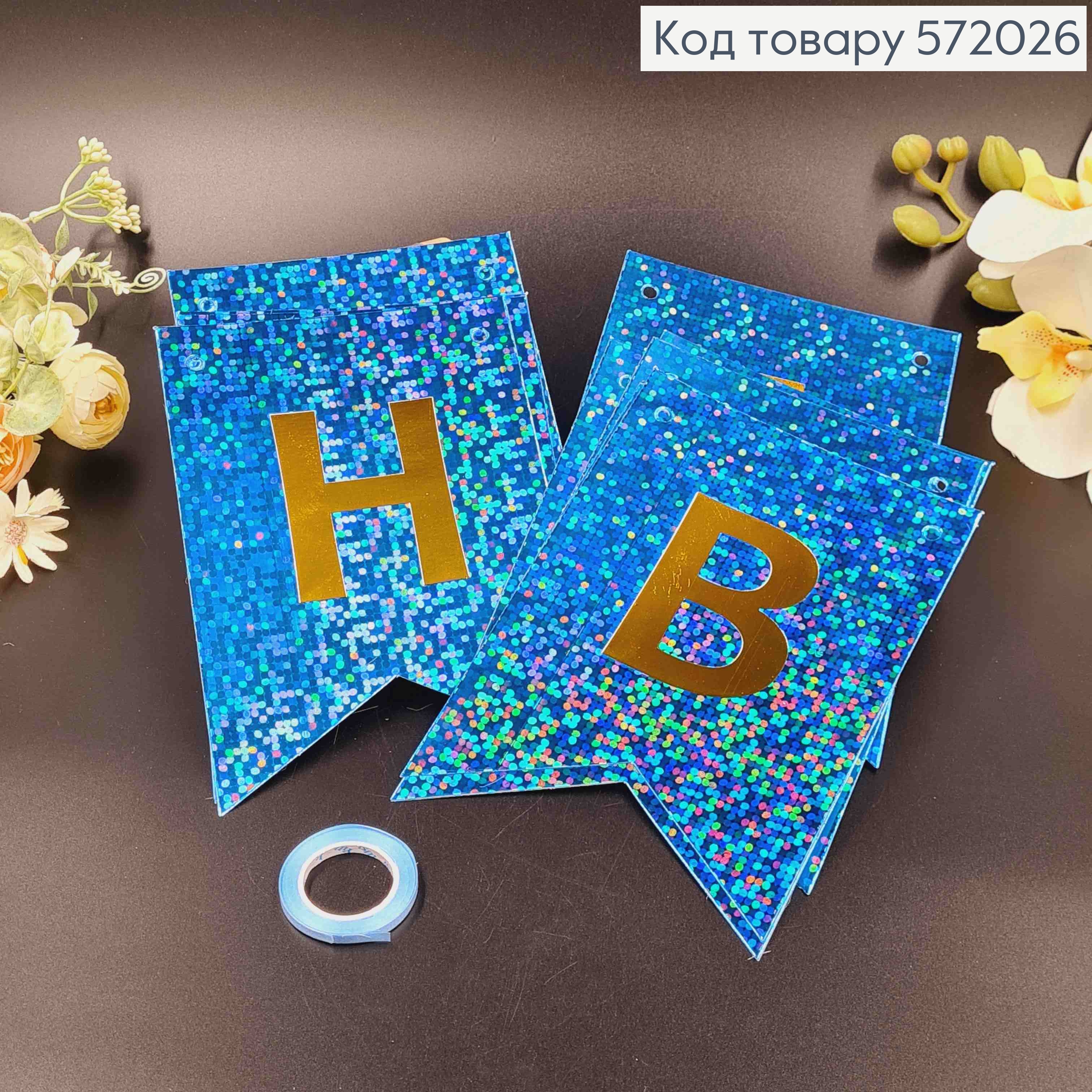 Гирлянда бумажная "Happy Birthday" Голубого цвета с голографическим узором 17*12см