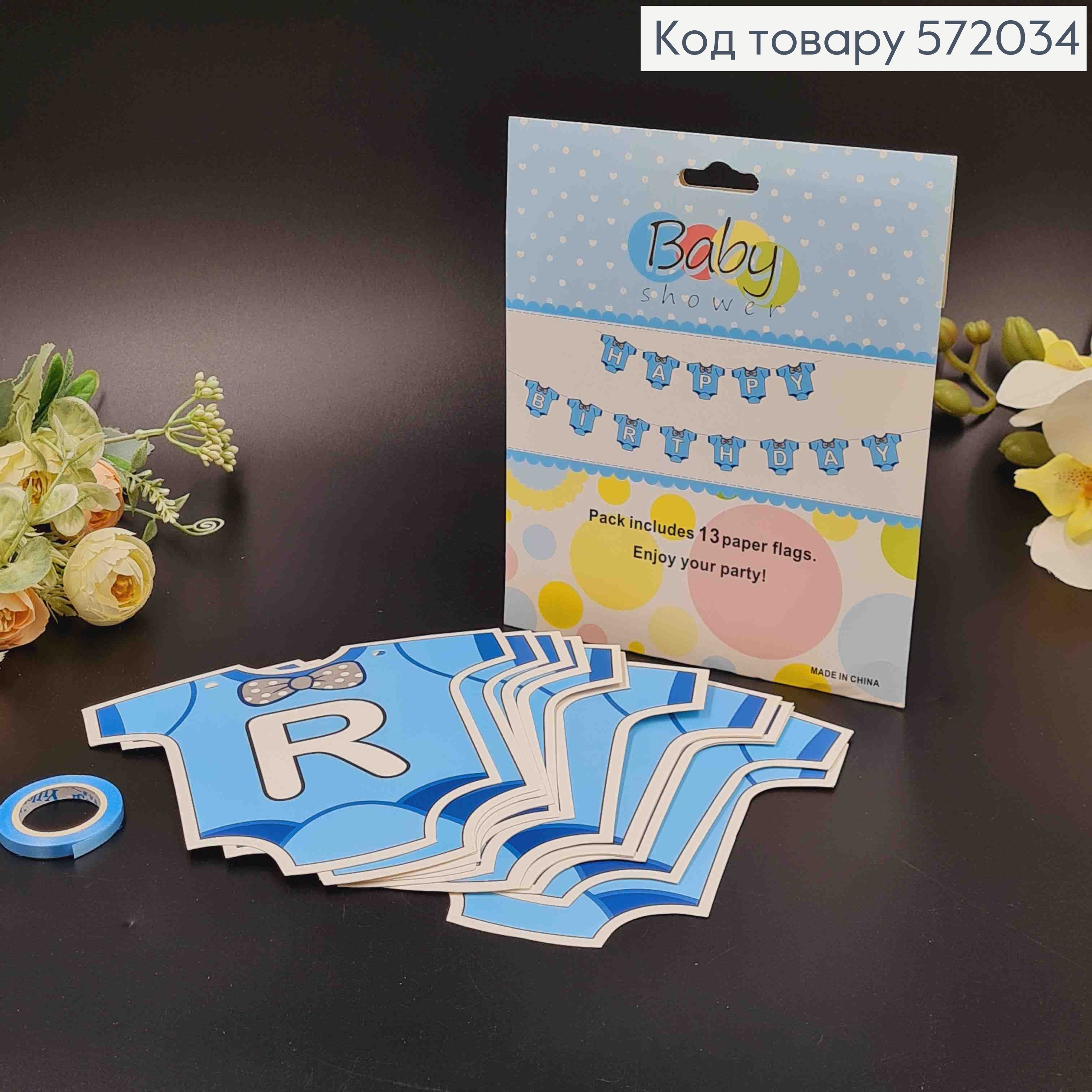 Гирлянда бумажная, "Happy Birthday" с детским бодиком, Голубой цвет, 13,5*14,5см
