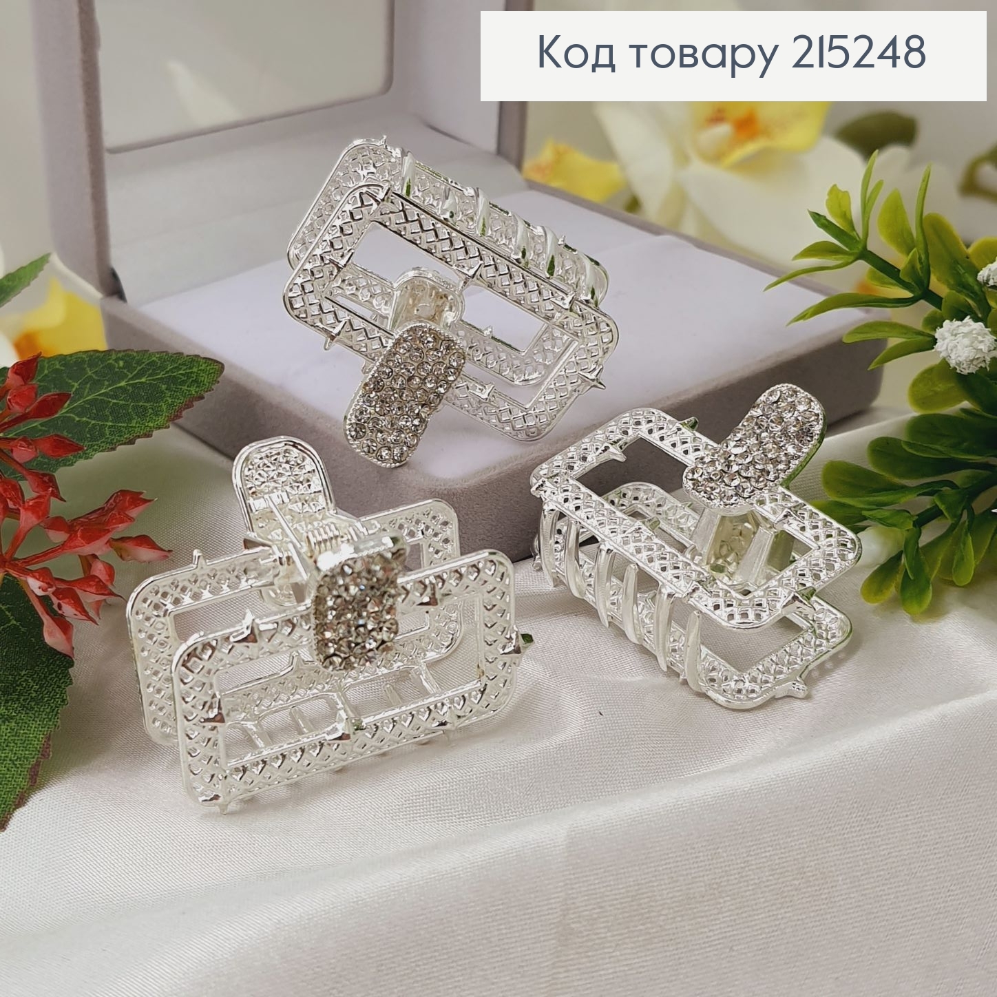 Краб металл "Петелька" украшен Блестящими камешками, 6см, Серебряного цвета 215776 фото