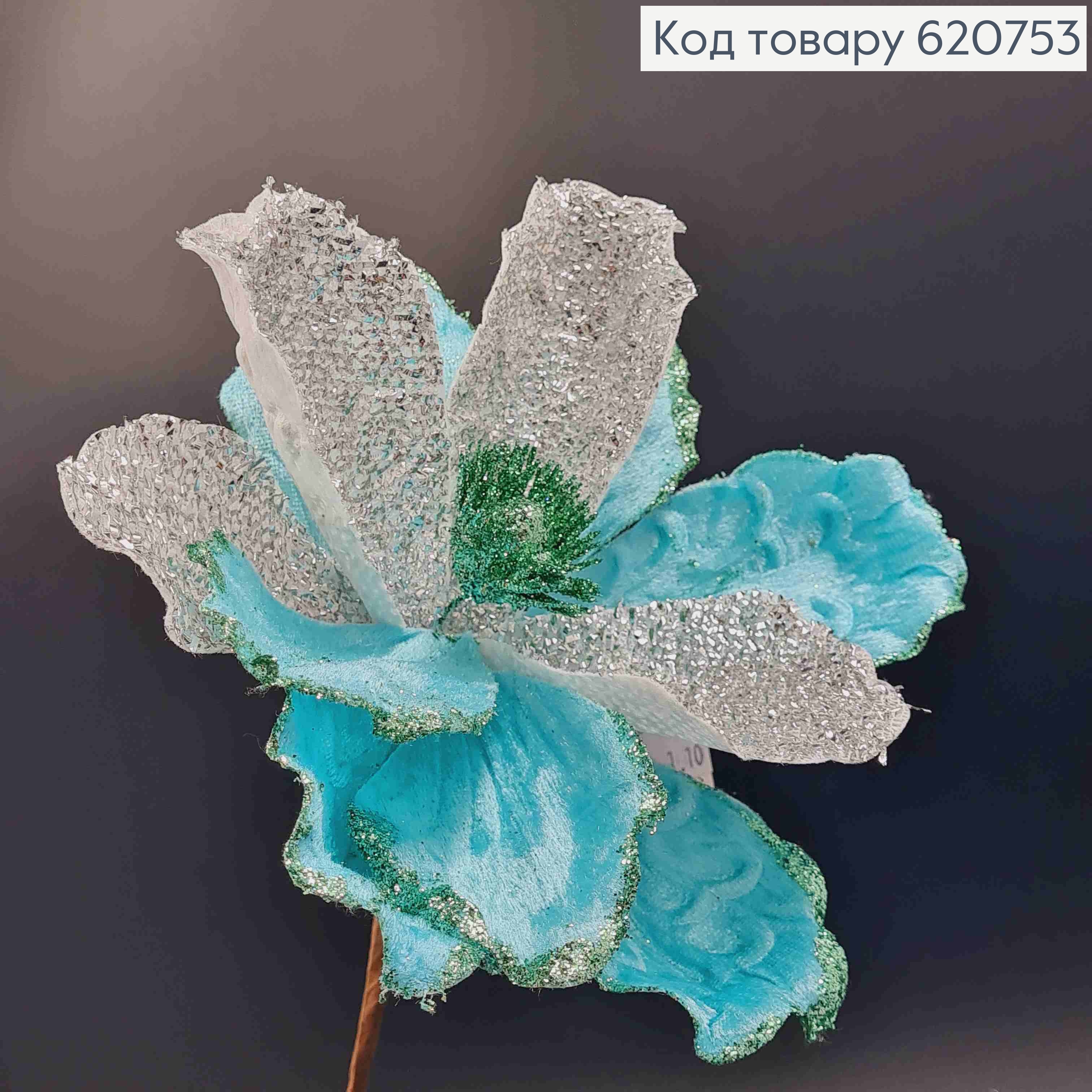 Цветок МАГНОЛИИ, БИРЮЗОВАЯ + серебро, диаметр 19-22см, на металлическом стержне 17см, бархатная 620753 фото