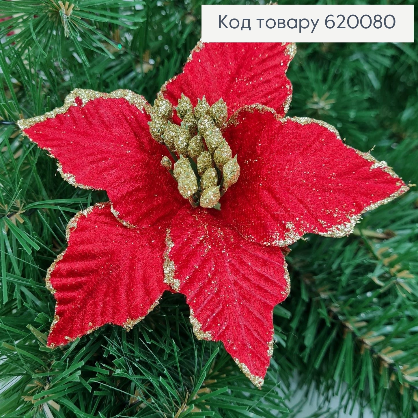 Цветок Рождественский красный глитерный д.13 см на металлическом стержне.