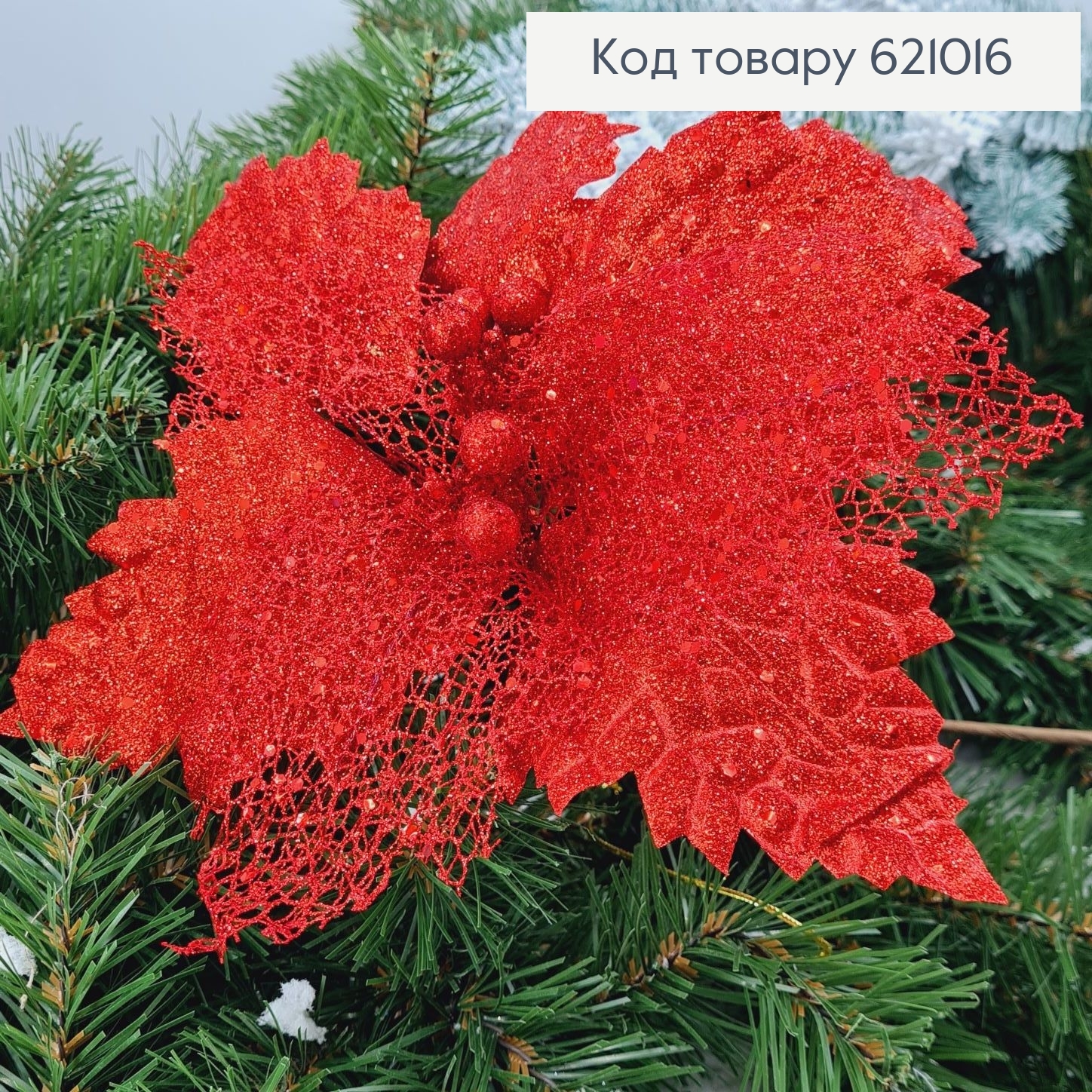 Цветок Рождественский глитер красный д.30 см на металлическом стержне 32 см