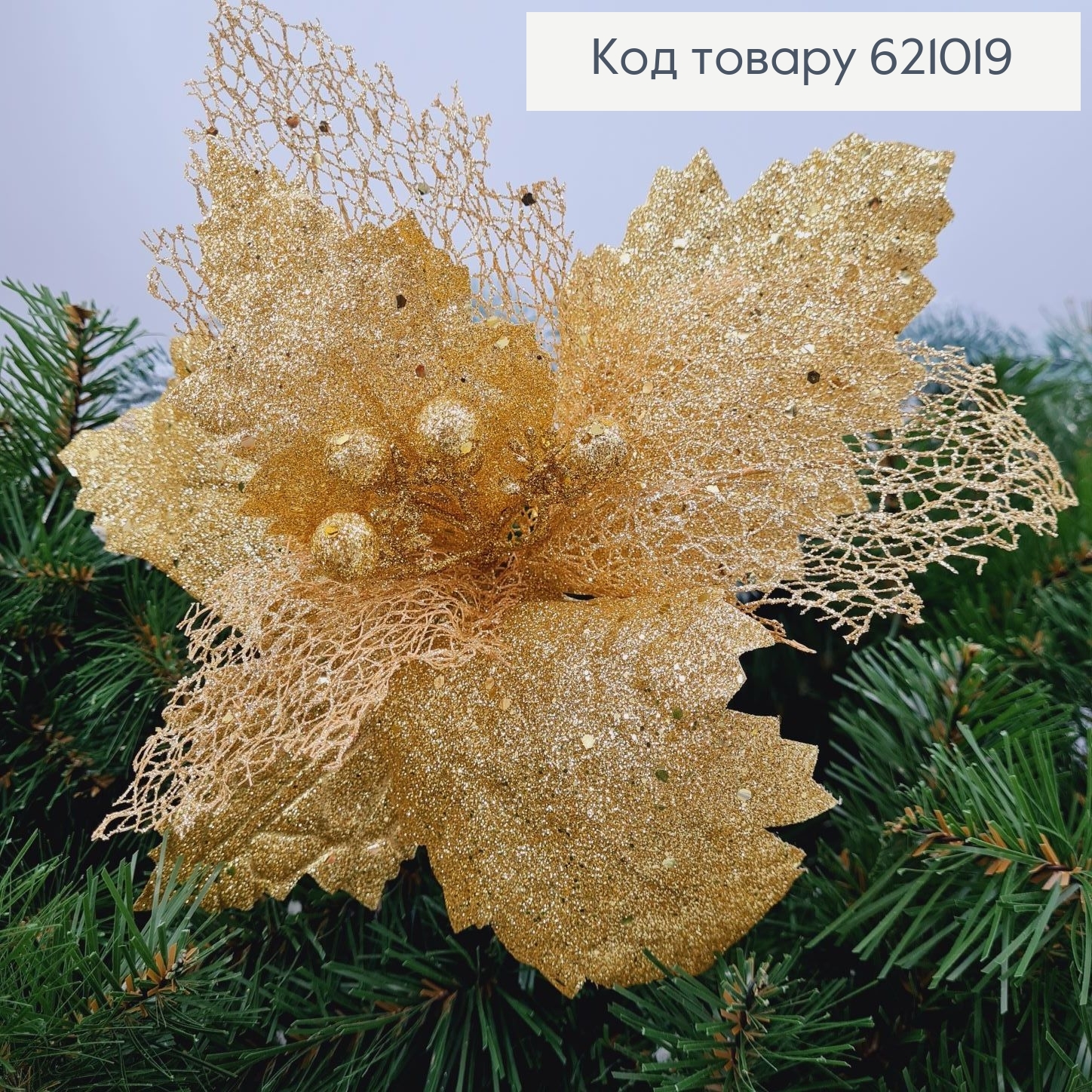 Цветок Рождественский глитер золотый д.30 см на металлическом стержне 32 см