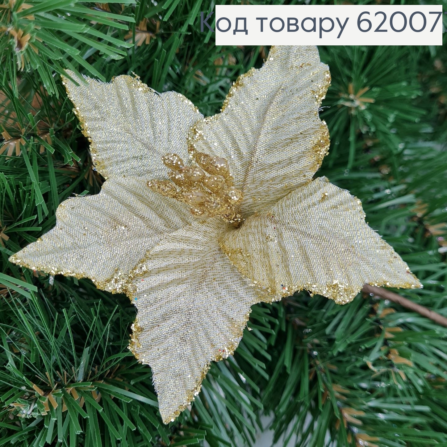 Цветок Рождественский золотой глитерный д.13 см на металлическом стержне.