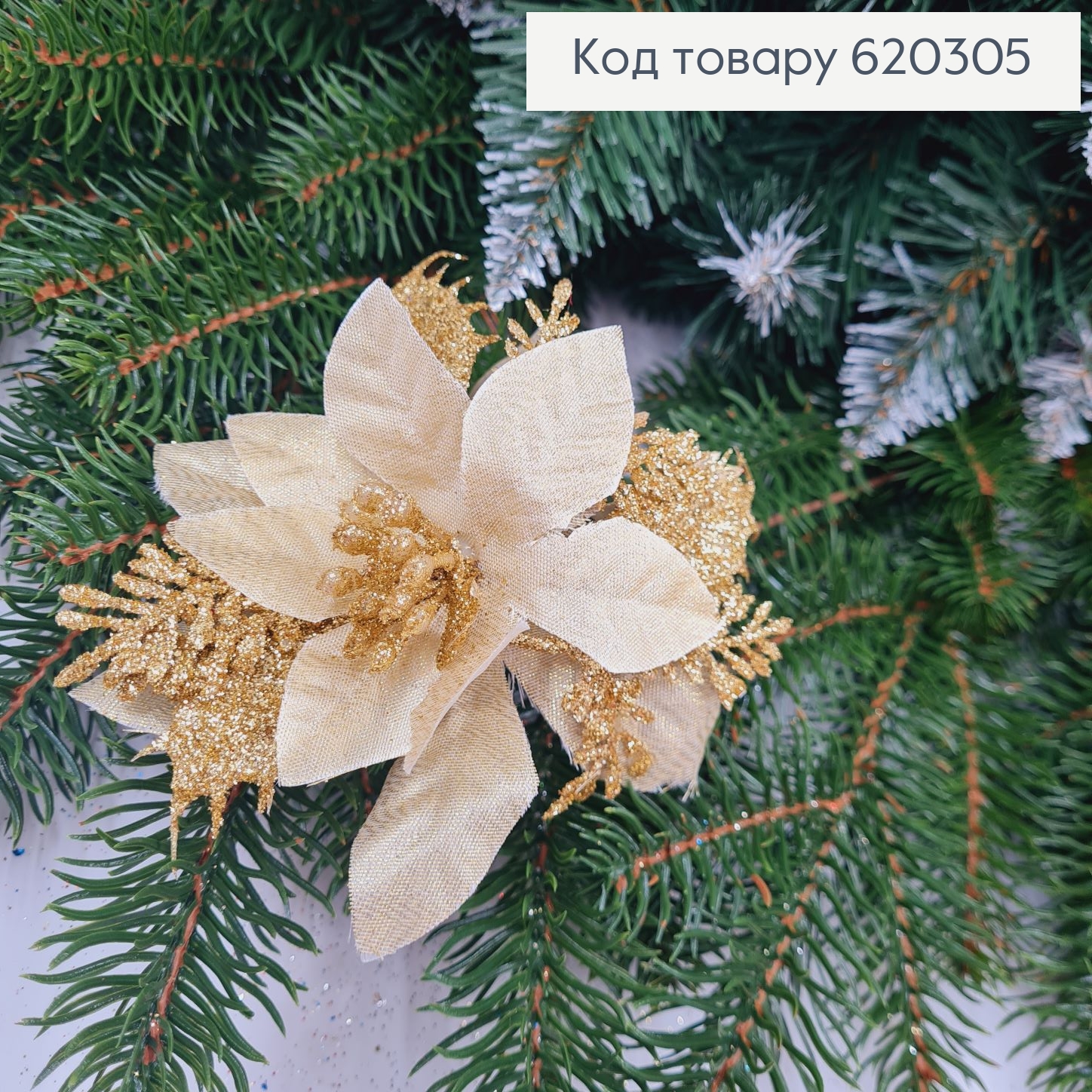 Цветок ПУАНСЕНТИЯ ЗОЛОТО глитер д. 12см на металическом стежне 18см